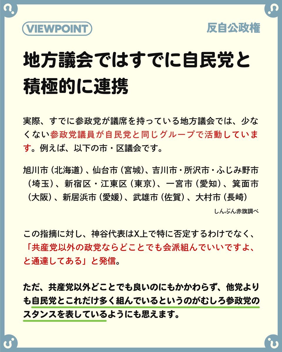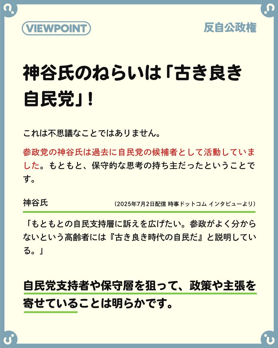 🔸「自民党が嫌だから参政党に入れる」は戦略的に正しいの?🔸 🔸コアな政策的立場は右派、多くの部分で自民党に近い🔸 🔸神谷氏のねらいは「古き良き自民党」!🔸 🔸地方議会ではすでに自民党と積極的に連携🔸 #ウワサの参政党 #参院選2025 #参政党 #投票へ行こう pic.x.com/lRxAe0JXNe