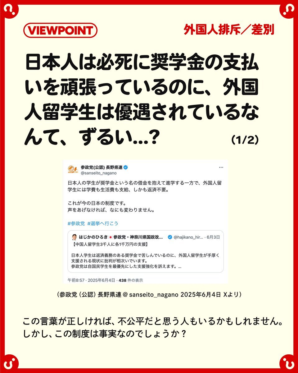 🔸日本人は必死に奨学金の支払いを頑張っているのに、外国人留学生は優遇されているなんてずるい...?🔸 🔸日本人の生活が苦しいのに、日本人が払った税金が外国人のために使われてるなんて、おかしい…? 🔸 #ウワサの参政党 #参院選2025 #参政党 #選挙へ行こう pic.x.com/Y1hoC4VoYs