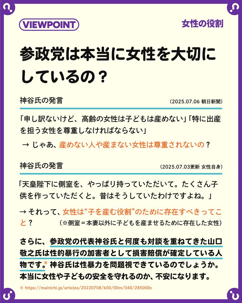 🔸参政党は本当に女性を大切にしているの?🔸 🔸すべての女性に寄り添ってくれる政策を掲げる政党はどこ?🔸 🔸女性の生き方はひとつではありません。🔸 出典 #ウワサの参政党 #参院選2025 #参政党 #投票へ行こう pic.x.com/xLekxYvKoj