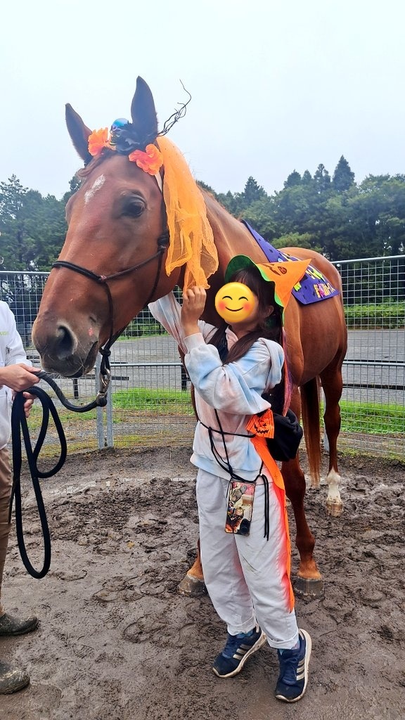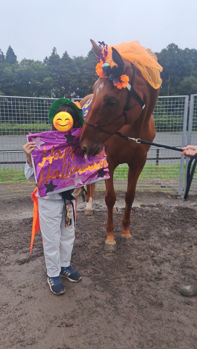 ハロウィンイベント・エアアルマス🎃アルマス君、私の13番の人参を食べてくれて上に乗らせていただいた🐴馬の背中は高くて不安定でびっくり!調べたら大好きな松山弘平騎手も乗ったことあるみたいでお尻合いになれた🤭アルマス君ありがとう🐴💕 #うまんまパーク #エアアルマス pic.x.com/bXclCeYdRl