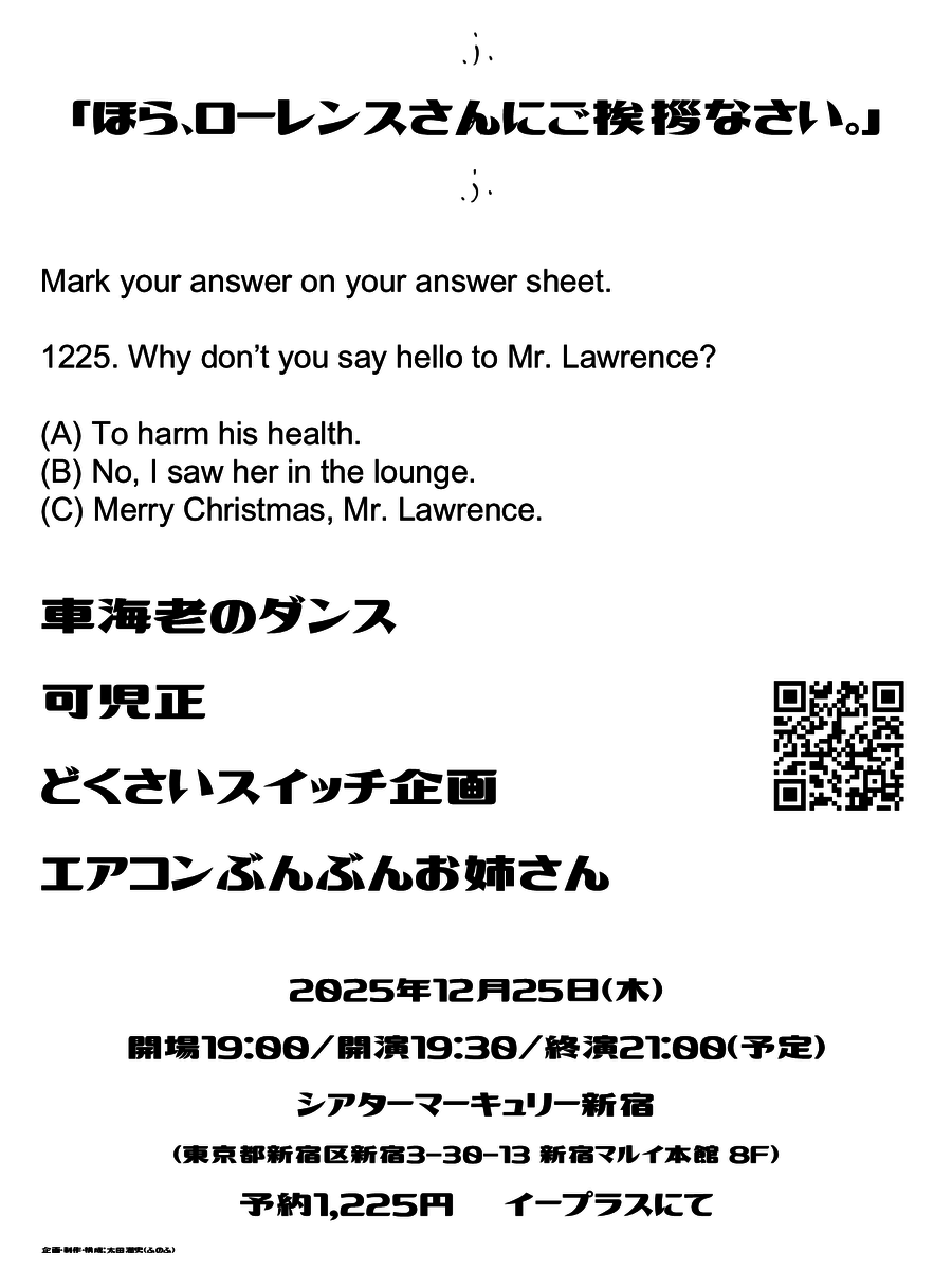 【📢一般発売中📢】 ふのふ ほら、ローレンスさんにご挨拶なさい。 🗓️12/25(木)19:30🎄 📍シアターマーキュリー 🎫¥1,225🎅 eplus.jp/sf/detail/4433… 👥#車海老のダンス #可児正 #どくさいスイッチ企画 #エアコンぶんぶんお姉さん ネタと企画のお笑いライブです🕯 手数料お得に発売中! pic.x.com/iSrB3kUVFU