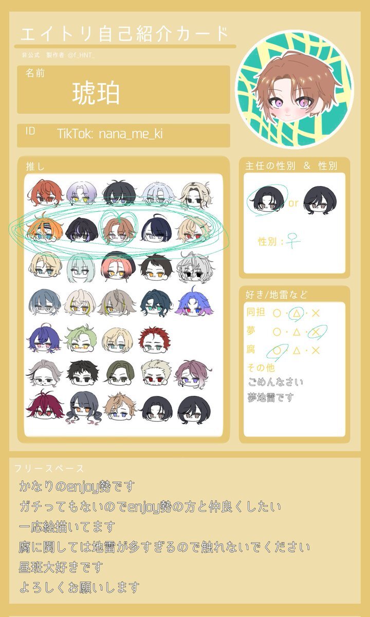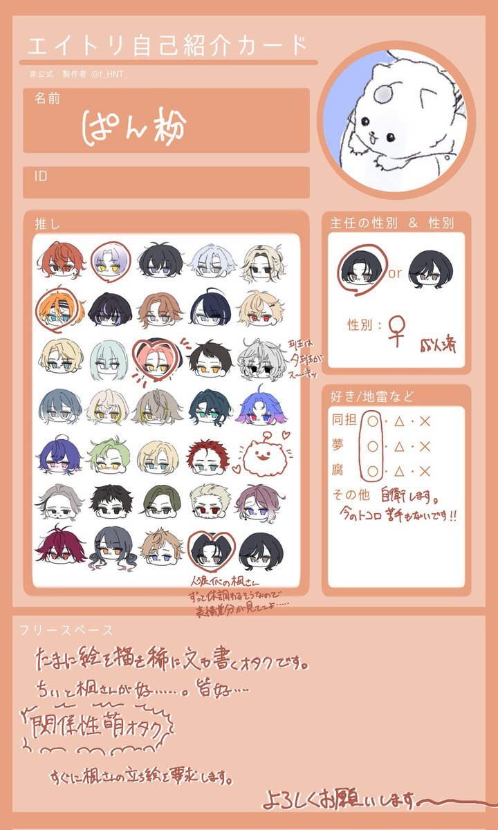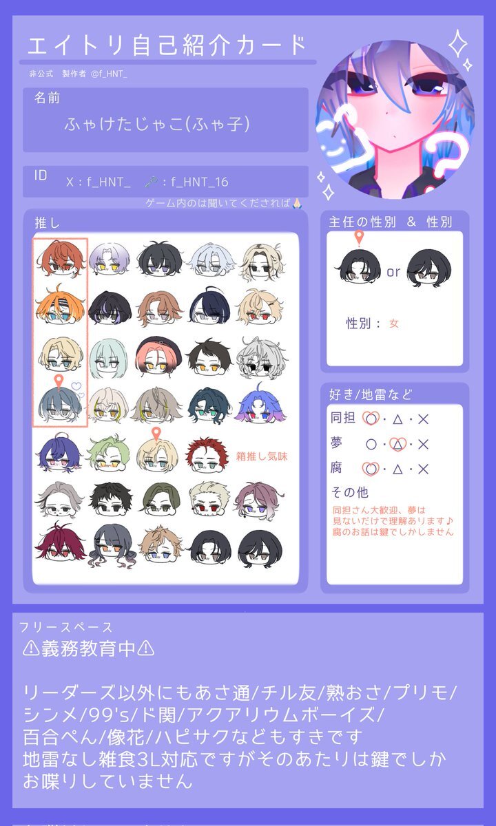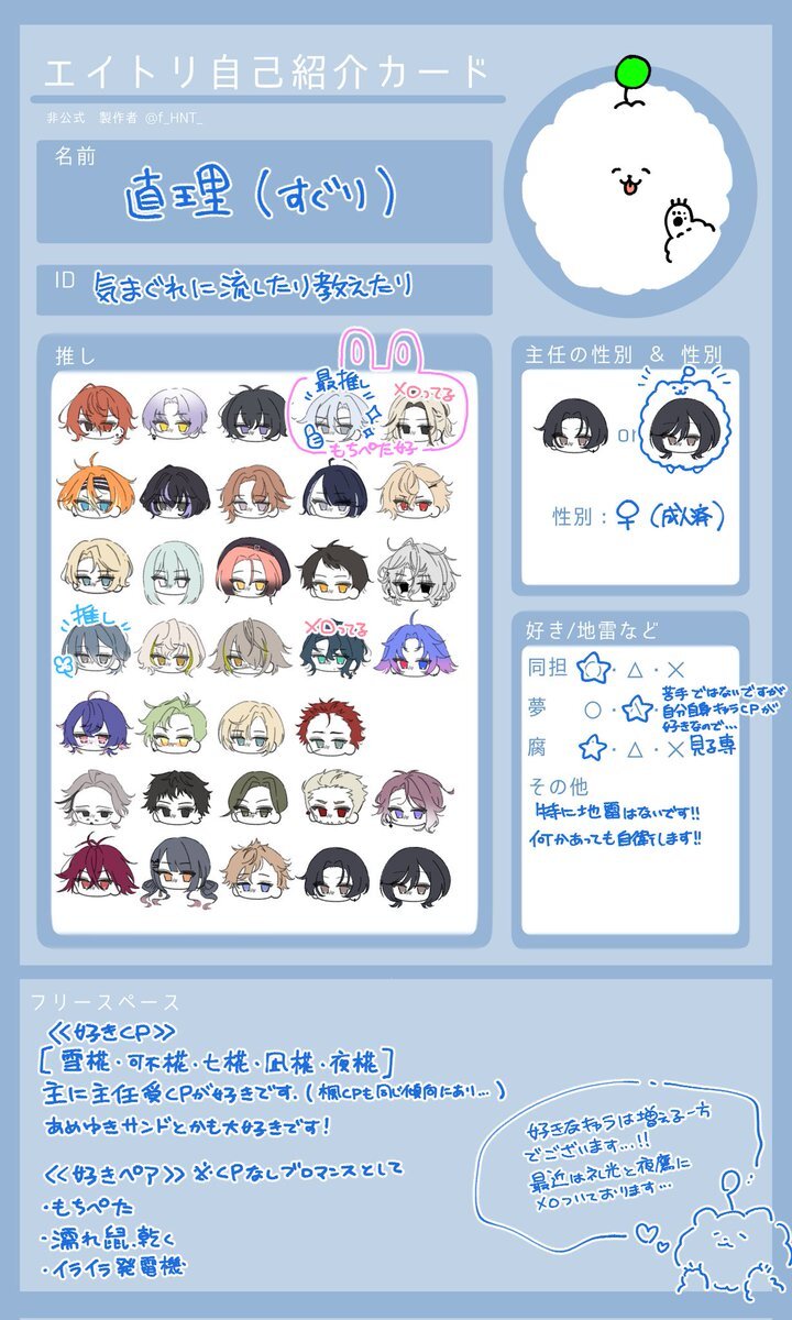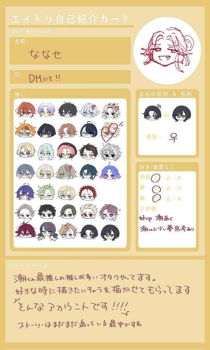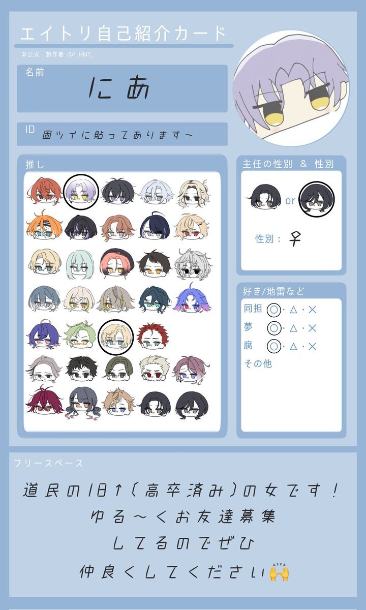ffちゃんの可愛い自己紹介カード使いたくてタグしまーす! 全反応気になった方お迎えに行きます〜! 同担◎他担◎ #エイトリ好きさんと繋がりたい #エイトリ絵描きさんと繋がりたい  #エイトリ自己紹介カード pic.x.com/vPsoyNfl1c