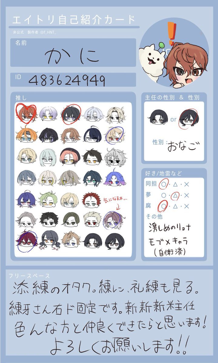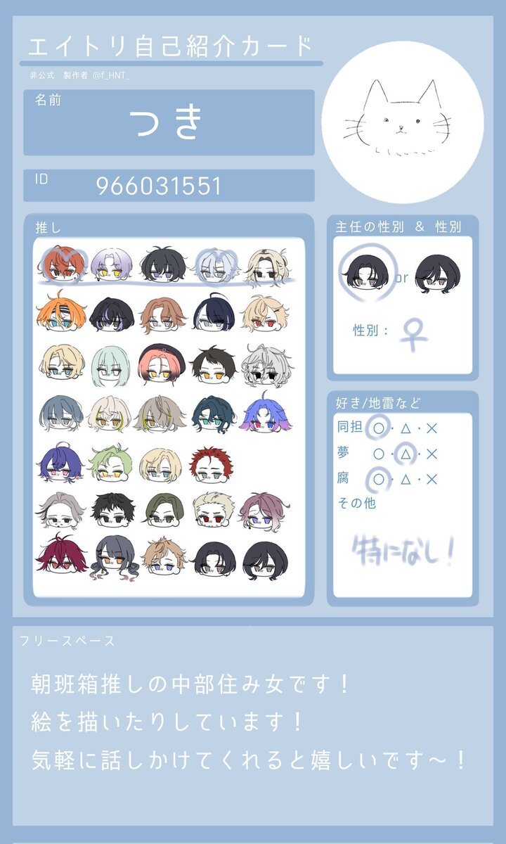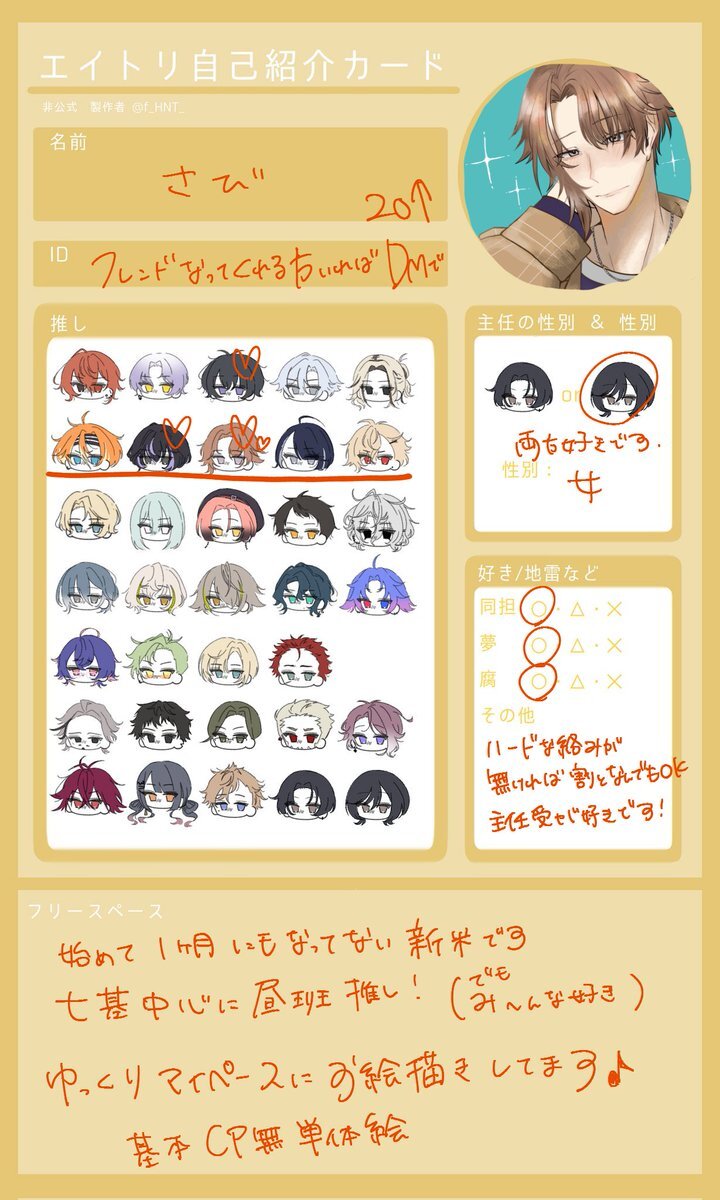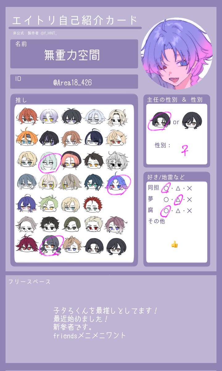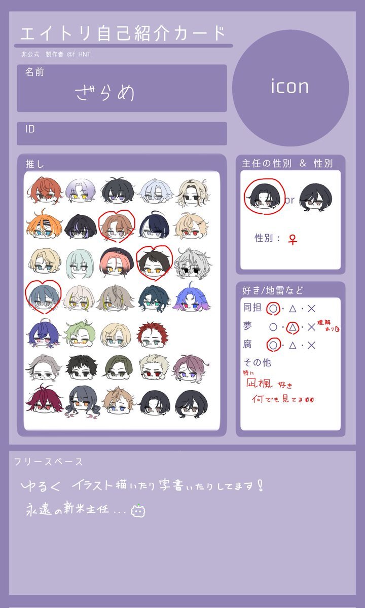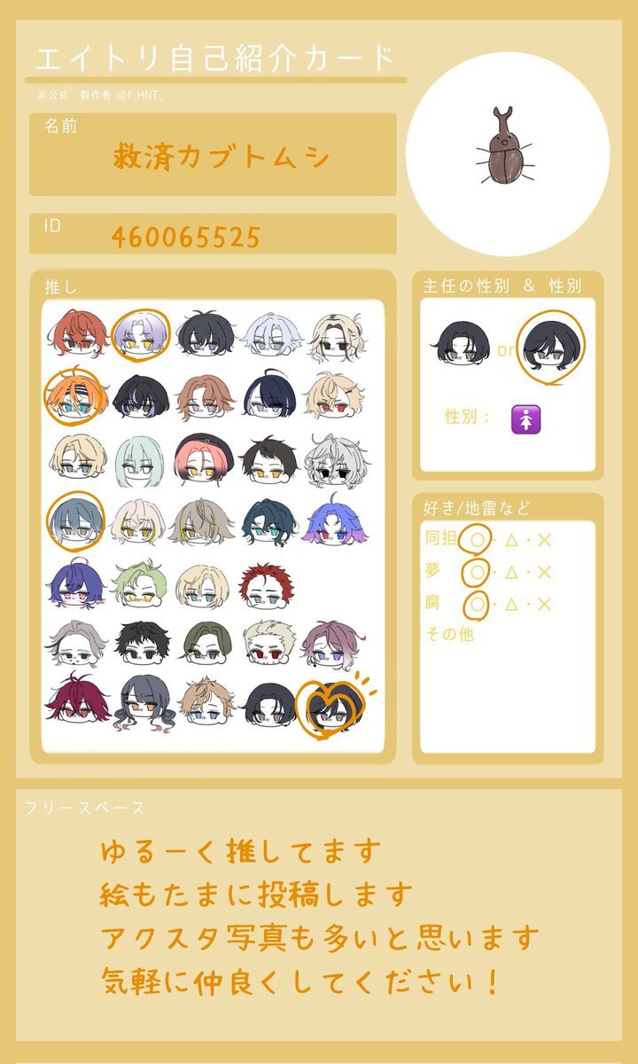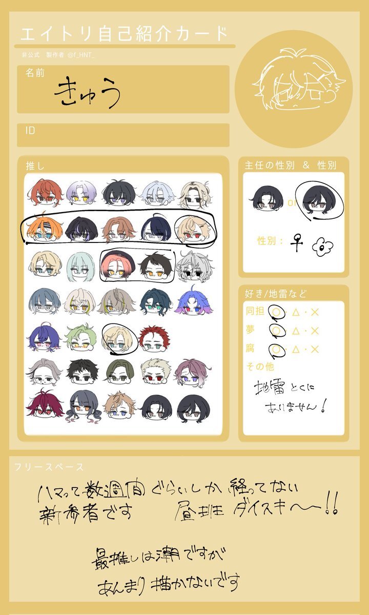 ffちゃんの可愛い自己紹介カード使いたくてタグしまーす! 全反応気になった方お迎えに行きます〜! 同担◎他担◎ #エイトリ好きさんと繋がりたい #エイトリ絵描きさんと繋がりたい  #エイトリ自己紹介カード pic.x.com/vPsoyNfl1c