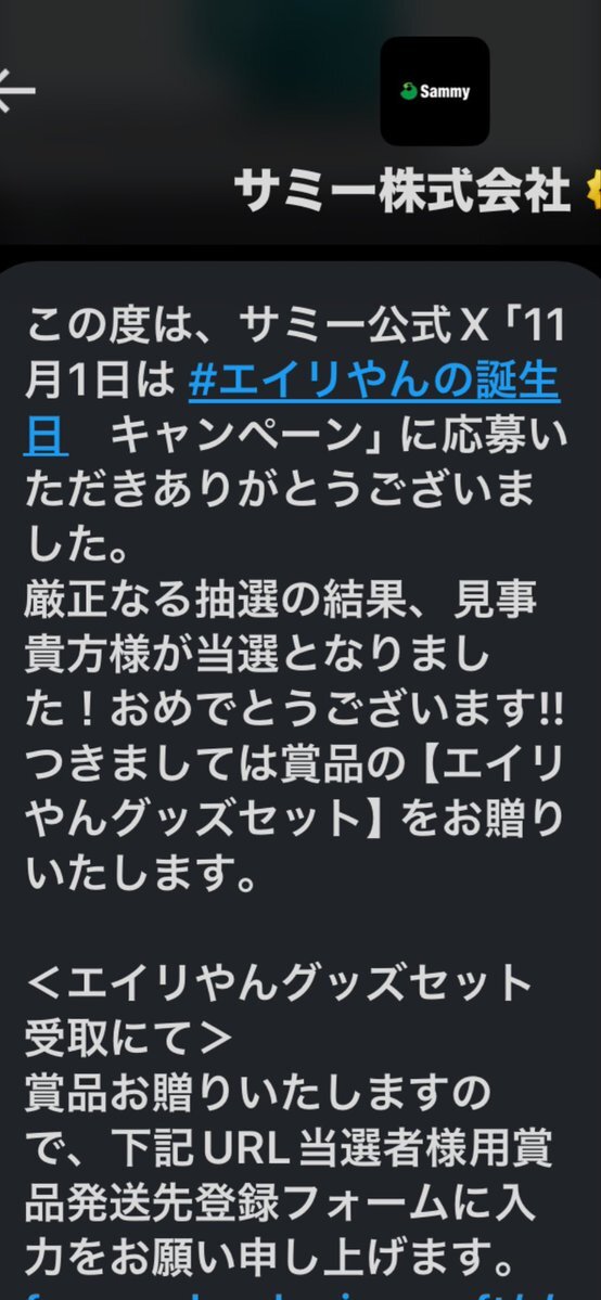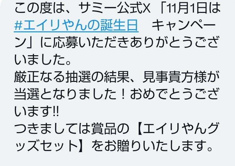 11月1日は何の日でしょう? #エイリやんの誕生日 サミーから当選の通知が来てました! 100名にエイリやんのグッズがプレゼント🎁されます。楽しみです❤12月上旬から中旬発送予定。 pic.x.com/jERW9KsyJ8