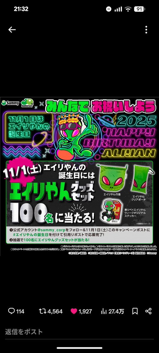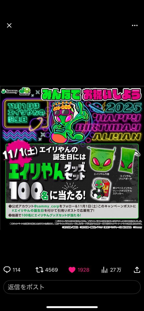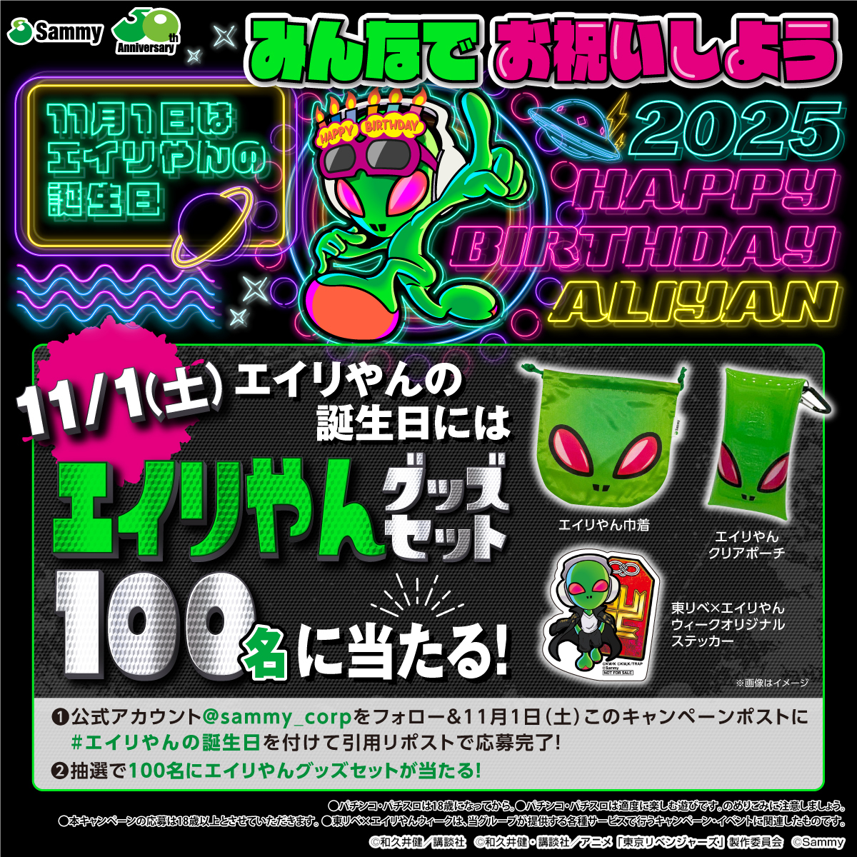🛸👽11月1日は #エイリやんの誕生日👽🛸 エイリやんの誕生日を記念してキャンペーンを開催🎁✨ @sammy_corp をフォロー&この投稿に #エイリやんの誕生日 を付けて引用リポストで応募完了✅ 抽選で100名にエイリやんグッズセットが当たる🙌 応募は本日23:59まで🔥
