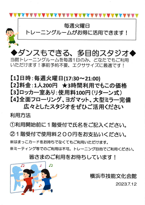 毎週火曜日の夜間(17:30~21:00)は、 #トレーニングルーム を個人(一人200円)でご利用いただけます! お一人で #ヨガ の練習、少人数での #エクササイズ に最適!😀 ヨガマット、大型ミラー完備のフィットネススタジオです♪✨✨ #横浜市技能文化会館 #関内 pic.x.com/1OgMsfrYot
