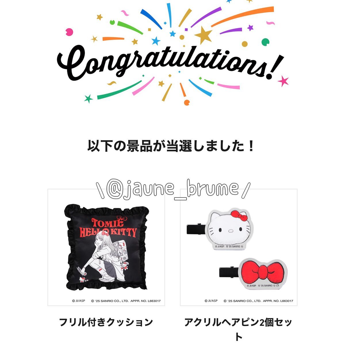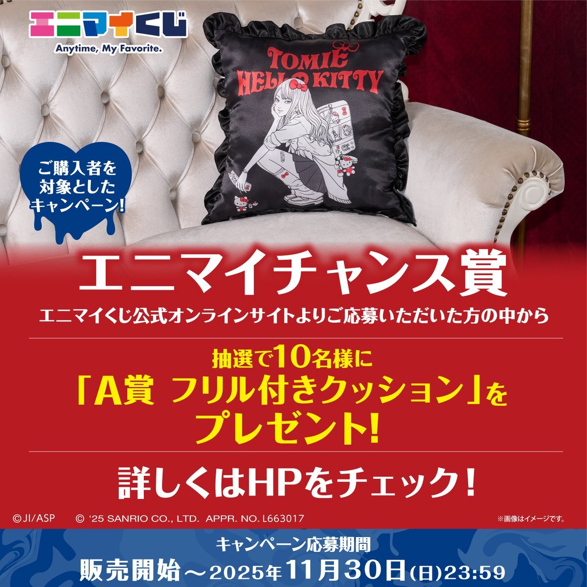 \🎀好評販売中🎀/ 『 #富江 × #ハローキティ 』くじ🎯 #エニマイくじ 公式オンラインにて、11/25(火)まで販売中です❣️ 購入者を対象としたエニマイチャンスキャンペーンも実施中✨ 抽選で10名様に「フリル付きクッション」が当たります🎁 ⬇️詳細はこちら anymy.jp/kuji/projects/… pic.x.com/oS8ArjS122