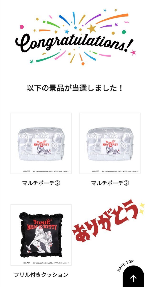 富江❌ハローキティ 3回だけ、とやったら… まさかのA賞クッションが出て嬉しい♥️ ポーチも保存と使うのとで嬉しいよ! ありがとうございます〜!! #エニマイくじ #富江 #ハローキティ pic.x.com/81wYAKpxe3