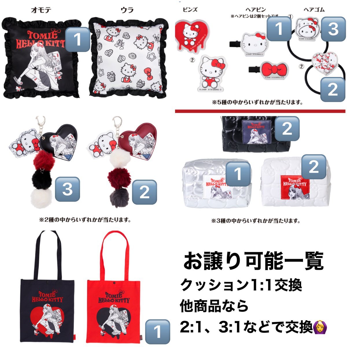 富江×ハローキティ交換 【譲】 画像1枚目参照 【求】C賞 トートバッグ 黒 クッションでしたら1:1、他景品でしたら2:1〜何個でも交換可能ですので求めているものをお持ちの方からのリプ、DMお待ちしております。 #富江 #ギャル富江 #エニマイくじ pic.x.com/y92kIF1665