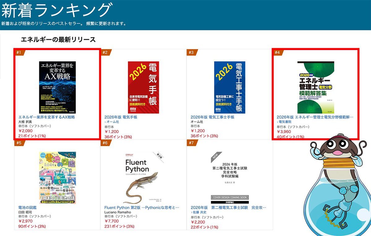 また「2026年版 エネルギー管理士電気分野模範解答集」も同ランキング4位となっております! こちらは10/30(木)発売予定です。 ご予約はこちらから👉amzn.asia/d/0mM4RYB (Amazonの販売ページにリンクされています) #エネルギー管理士 #エネ管 pic.x.com/GQIon9qUfC x.com/denkishoin/sta…