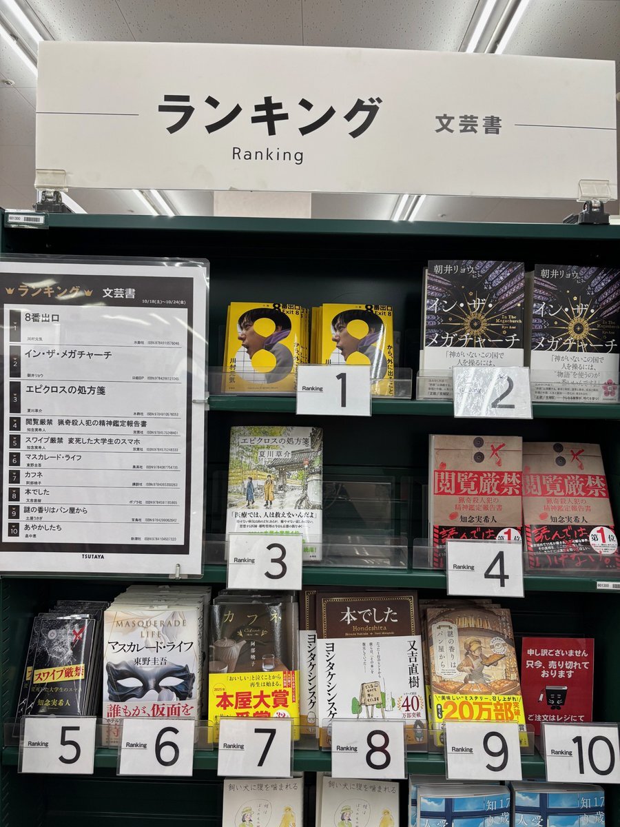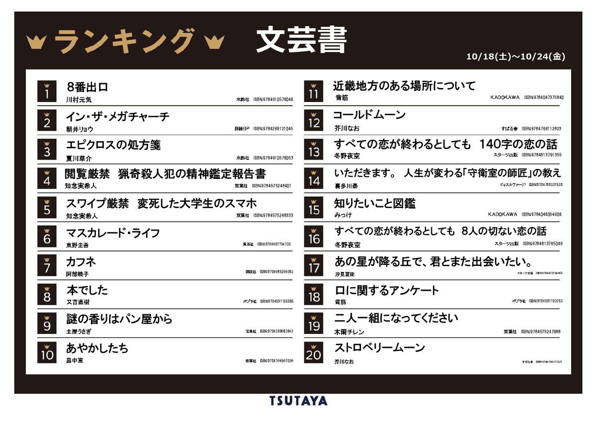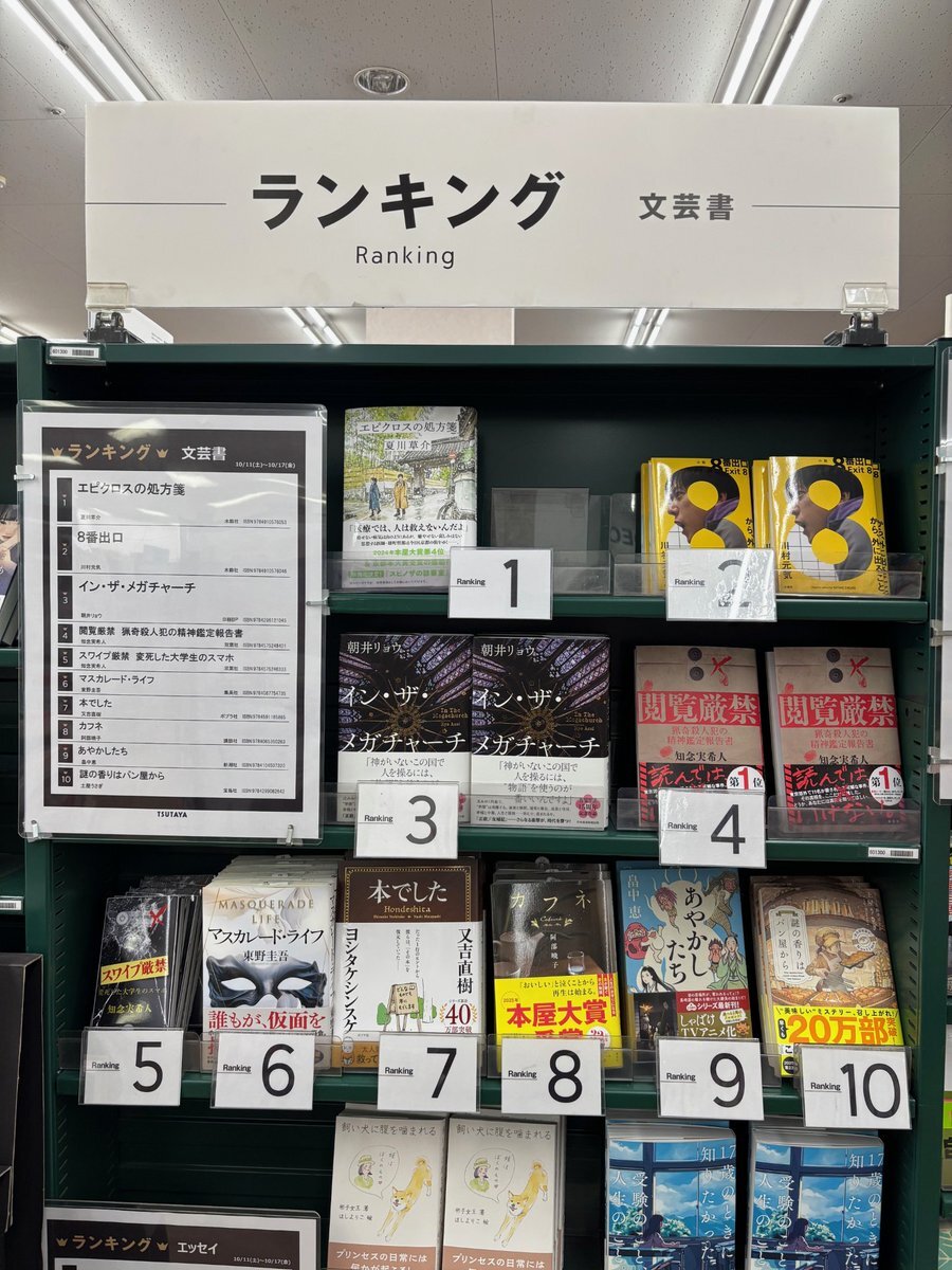 🙌TSUTAYA文芸書ランキングでも🙌 🥇『#小説8番出口#川村元気✨ 3️⃣『#エピクロスの処方箋#夏川草介#水鈴社 の本。引き続きよろしくお願いいたします! x.com/futabaofficial…