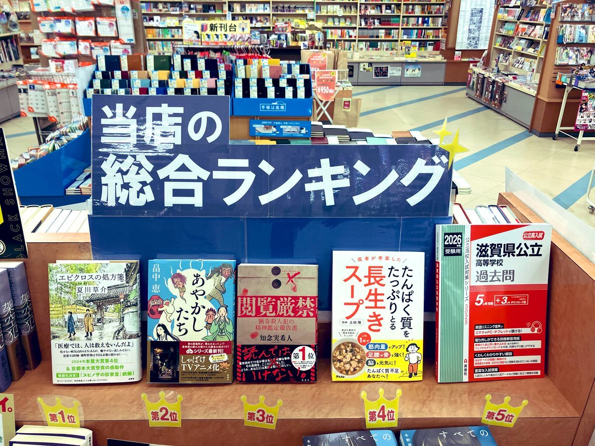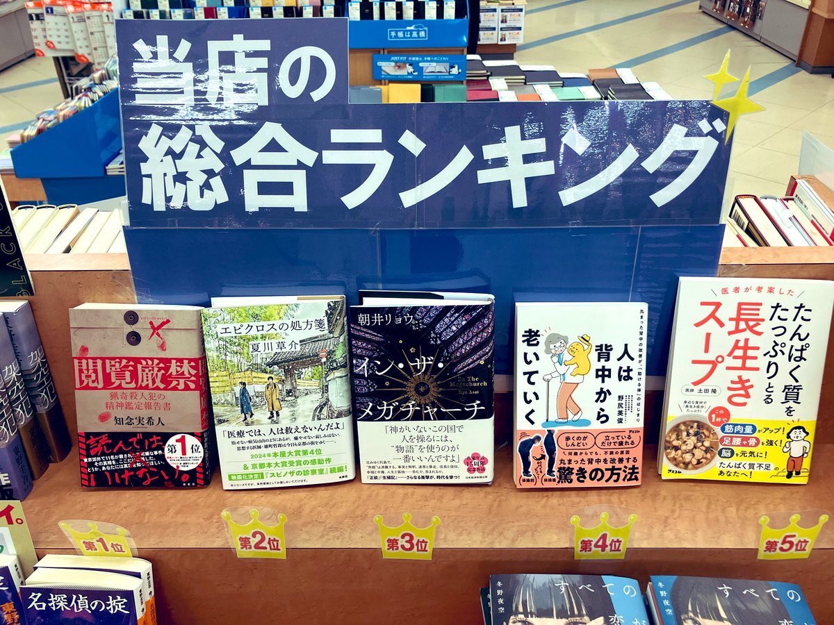 TSUTAYA文芸書ランキング イン・ザ・メガチャーチ/朝井リョウ 日本経済新聞出版 …推し活のイメージが一変、読んでしまったらもう戻れない一冊 エピクロスの処方箋/夏川草介 水鈴社 …「スピノザの診察室」続編、正と死、医師の矜持に胸が熱くなる一冊 HP futabatosho.co.jp/18469 #フタバ図書 #読了