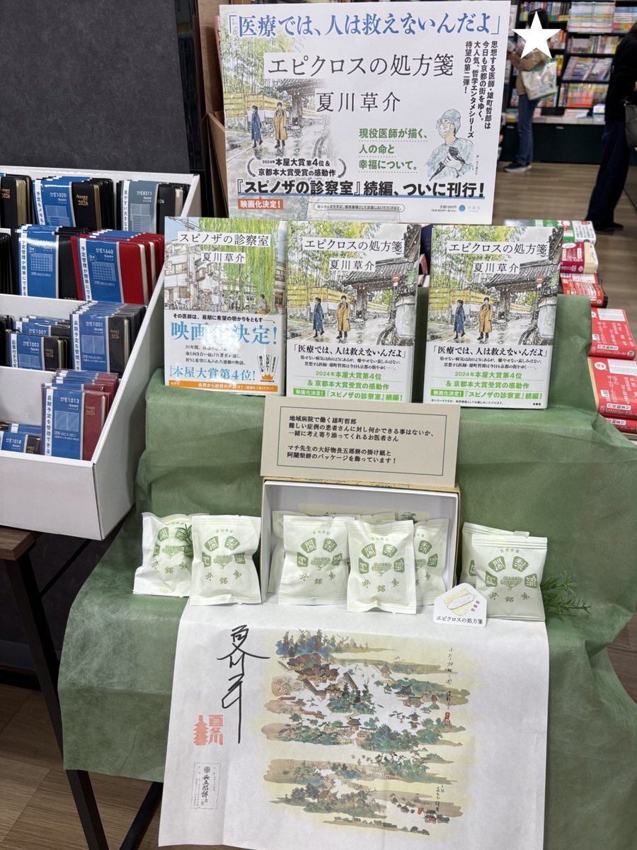 #エピクロスの処方箋』 地域病院で働く雄町哲郎 難しい症例の患者さんに対し何かできる事はないか、一緒に考え寄り添ってくれるお医者さん マチ先生の大好物長五郎餅の懸け紙と阿闍梨餅のパッケージを飾っています! #夏川草介 さん #水鈴社 #未来屋書店武蔵狭山店 pic.x.com/kA1ehOc8pI