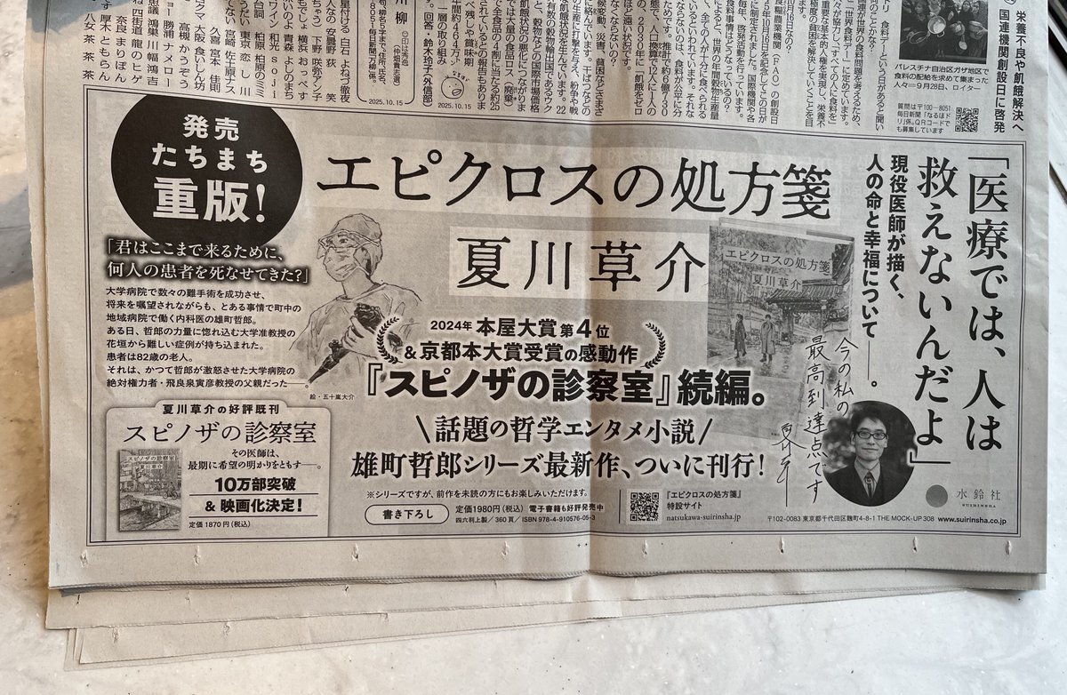 ㊗️重版㊗️ #夏川草介#エピクロスの処方箋』 本日の毎日新聞朝刊に全5段広告を掲出しました! 現役医師が描く人の命と幸福についてーーー『#スピノザの診察室』につづく雄町哲郎シリーズの最新作(本作単体でもお楽しみいただけます👌)、おすすめです💨 #水鈴社 pic.x.com/uAwWr3TbiG