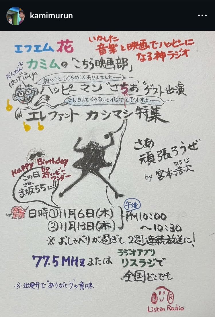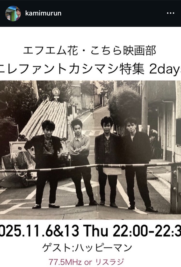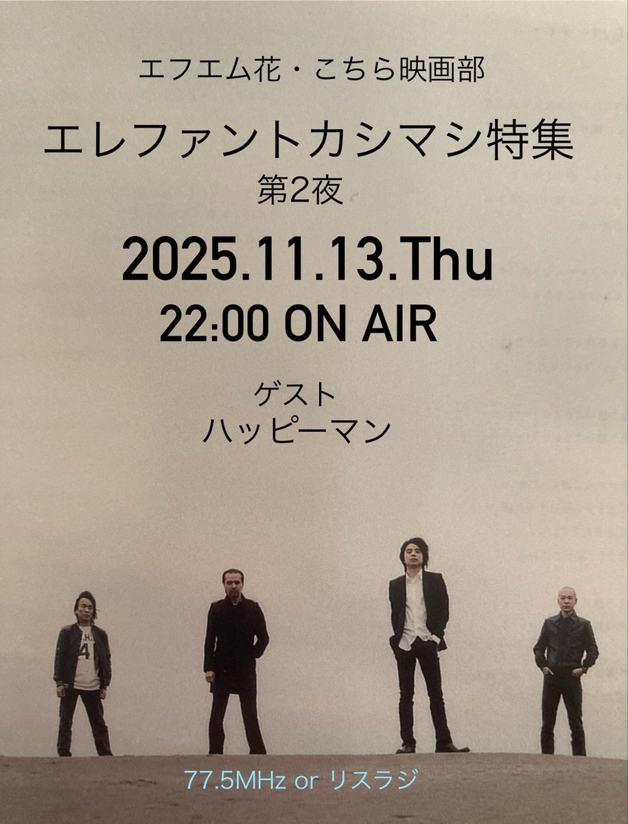 🐘🐘エビバデ集合🐘🐘 今夜ON AIR! 🔥エレファントカシマシ特集🔥ラジオ 11月13日(木) 22:00〜22:30 📻エフエム花「こちら映画部」 77.5MHz 又は リスラジ(アプリ) ※アプリ使い方はリプへ Anly繋がりショコにいさん情報✨ お心遣いに感謝です🙏 #エフエム花 #エレカシ x.com/kamimurun/stat…