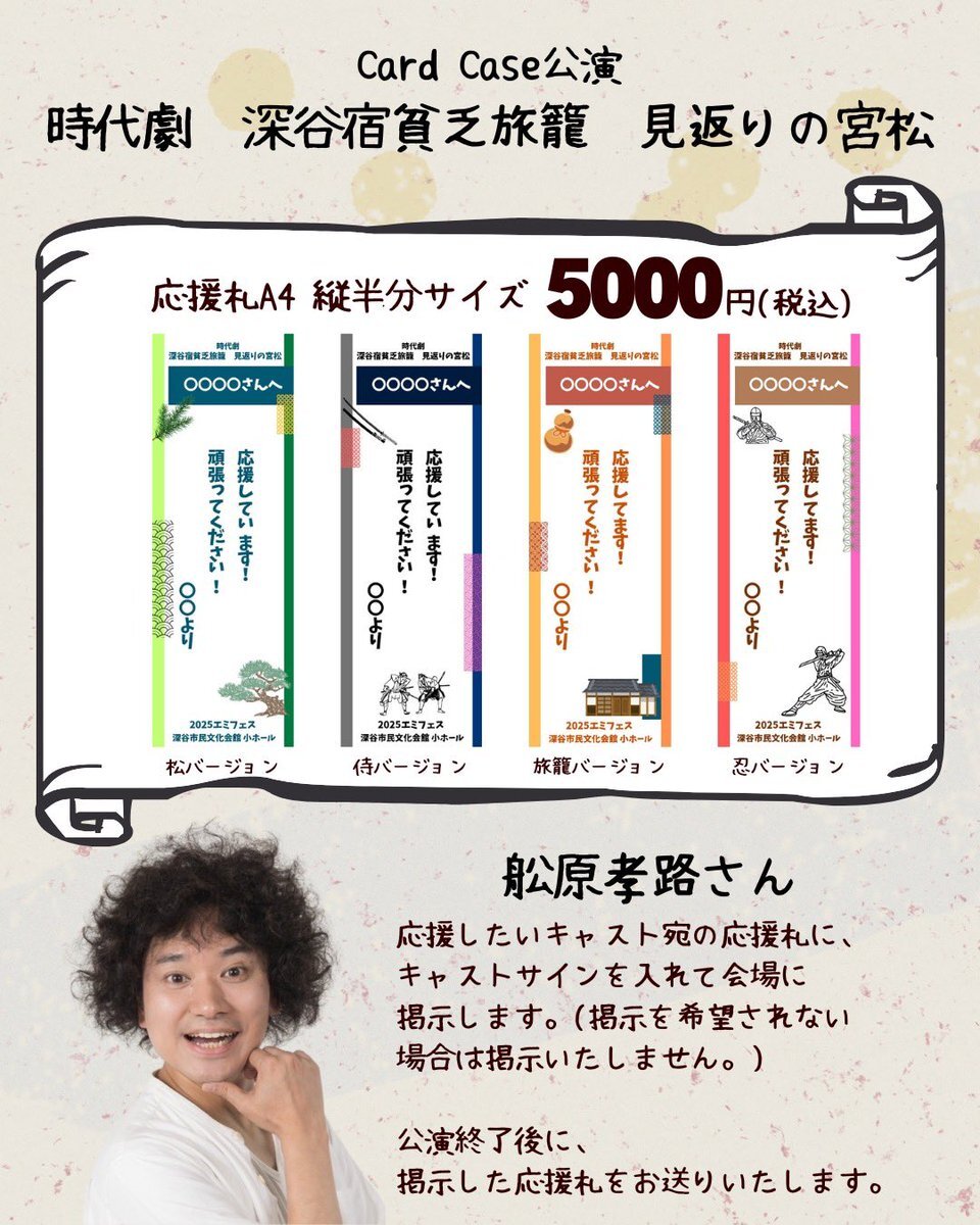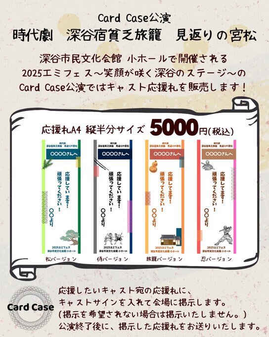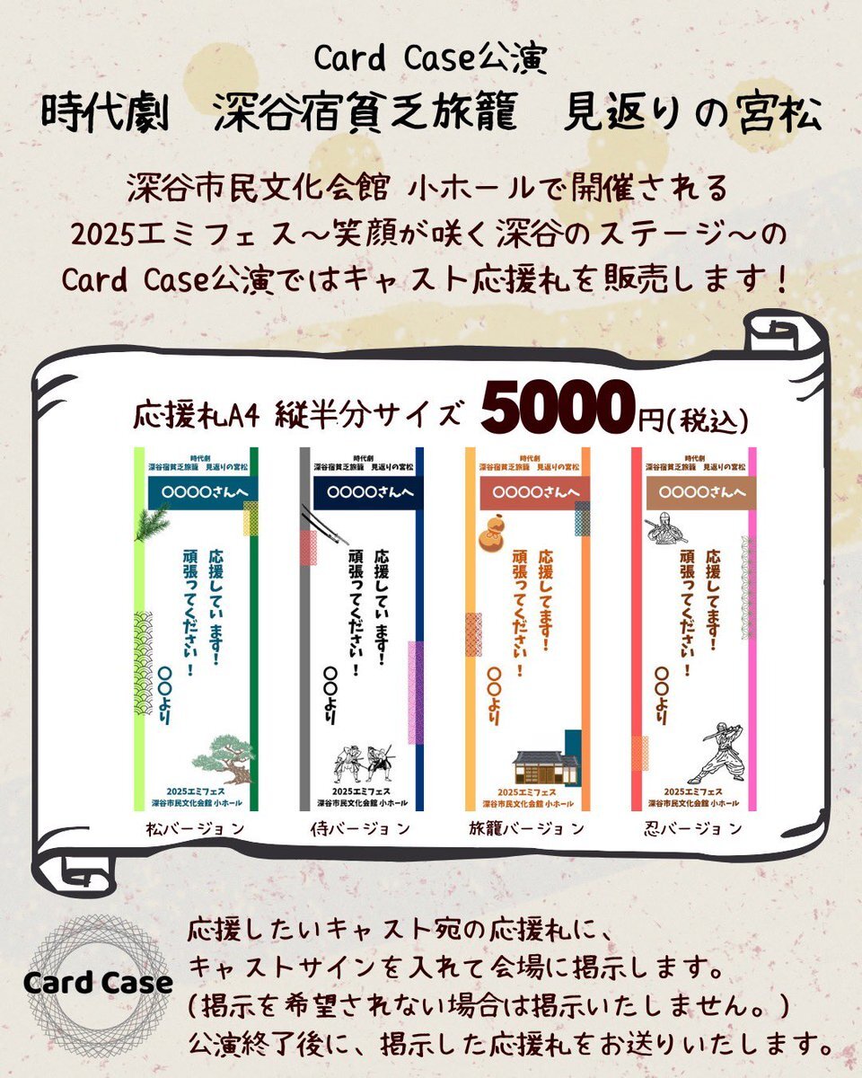 CardCase公演ではキャスト応援札を販売します✨ 応援札にサインを入れ、エミフェス会場に掲示します☺️✨ 全公演終了後にはご自宅にお送りいたします💐✨ 応援札は、11/24(月)24:00まで販売‼️ ぜひ応援よろしくお願い申し上げます‼️ ryota-miyashita-produce.square.site #エミフェス #深谷 #見返りの宮松