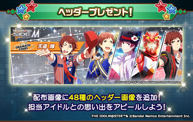 最後に、アイドルの皆さんとのお仕事の思い出をいつでも振り返れるよう、Twitter用のヘッダー画像を用意しています。 たくさんありますので、画像のラインナップはキャンペーンページからご確認お願いしますね。 活動に役立ててもらえると嬉しいです! g12017647.sp.pf.mbga.jp #SideM #エムマス pic.x.com/Hck91iZPWw