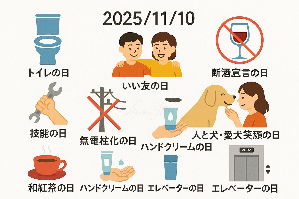 今日は何の日? 11月10日 ・トイレの日 ・いい友の日 ・断酒宣言の日 ・肢体不自由児愛護の日 ・平和と開発のための世界科学デー ・技能の日 ・川口の日 ・無電柱化の日 ・人と犬・愛犬笑顔の日 ・島唄の日 ・下半身痩せの日 ・和紅茶の日 ・かりんとうの日 ・カリカリ梅の日 ・希少糖の日
