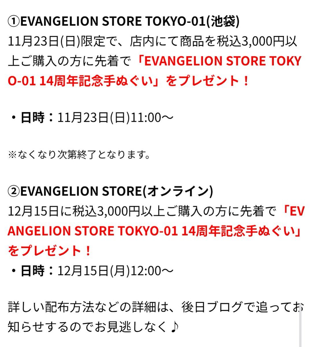 【お知らせ:EVANGELION STORE TOKYO-01(池袋店)にて開催! 14周年記念手ぬぐい配布&ゆるしとグリーティング情報!!】(2025.11.18更新) 11月23日(日)配布「14周年記念手ぬぐい」の整理券配付時間の詳細や、ゆるしとグリーティングの情報を公開しました! ▼詳しくはブログをチェック!▼