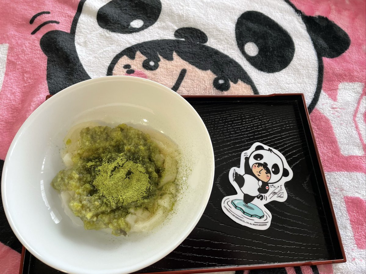 ずんだ餅の上に駿君の大好きな抹茶をかけて 🟩🟩🟩🟩🟩… TESカウンター速報値が緑で溢れます様に いちじくを煮たり 「牛肉のトマト煮仙台味噌風味」を煮込んだり 必勝⭐️カレー饂飩の汁(スープ)に具材投入で味噌汁にしたり 準備出来ることを積み重ねて過ごしました #火の鳥 #佐藤駿 #エームサービス