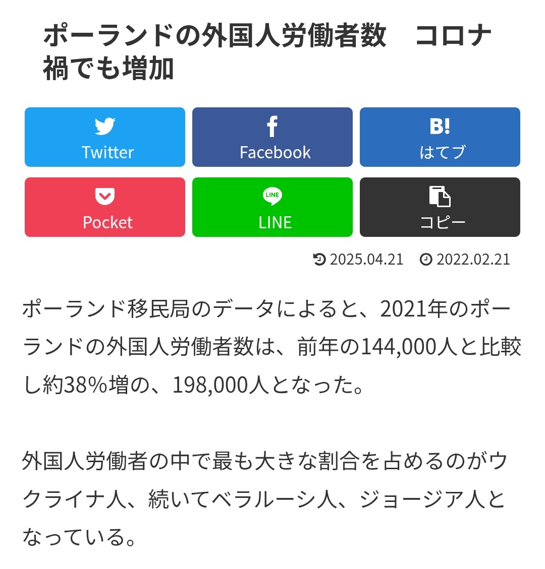 返信先:@tibanojirotyou#いやそのりくつはおかしい (@∀@)つ【現実】≫ポーランドは5年連続で、EU域外からの移民に最初の居住許可を発行した件数がEU最多となった ≫外国人労働者登録者数は、2015年の20万人未満から6倍以上に増加し、現在は113万人超 etias.jp/%E8%A8%98%E4%B… #オタクだからこそ基本的人権を守る pic.x.com/Ghxl0lkCu2