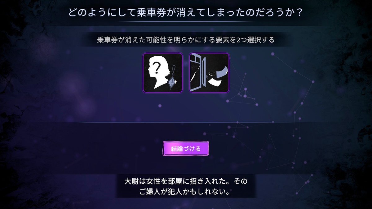 このテのゲームではお約束、最初のチュートリアル的な推理で既に面白い。登場人物のセリフをちゃんと覚えておく必要があったり、状況をパズルのように順に当てはめていく謎解きも楽しい😆 #オリエント急行殺人事件 pic.x.com/Z9g8xWnFa8