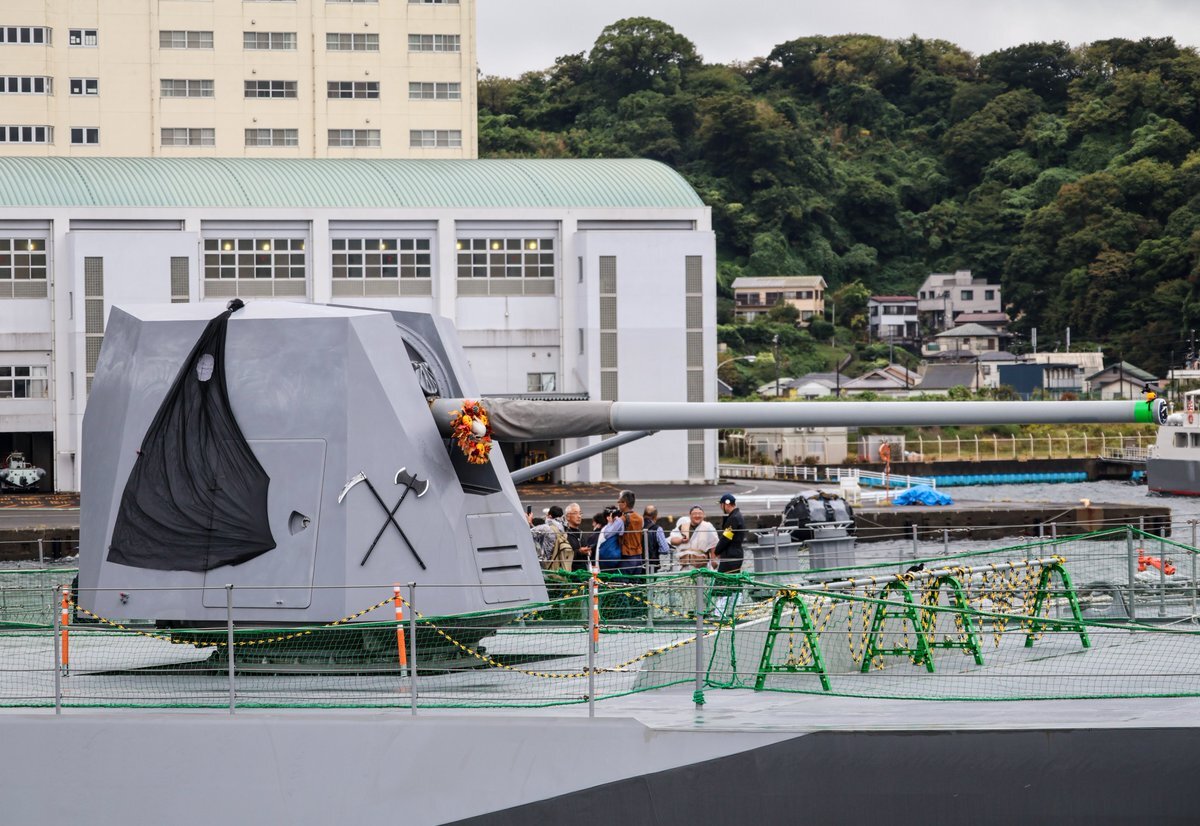 おはようございます🌸 #オータムフェスタ2025 あいにくの雨模様でしたが、そのおかげで #ハロウィン の雰囲気満載の #護衛艦まや の主砲が撮れました🎃 これも地味ハロウィンになるかな?海の防人たちのこういう遊び心も嬉しいですね。 #Halloween #海上自衛隊 x.com/k_JSDFouendan/…