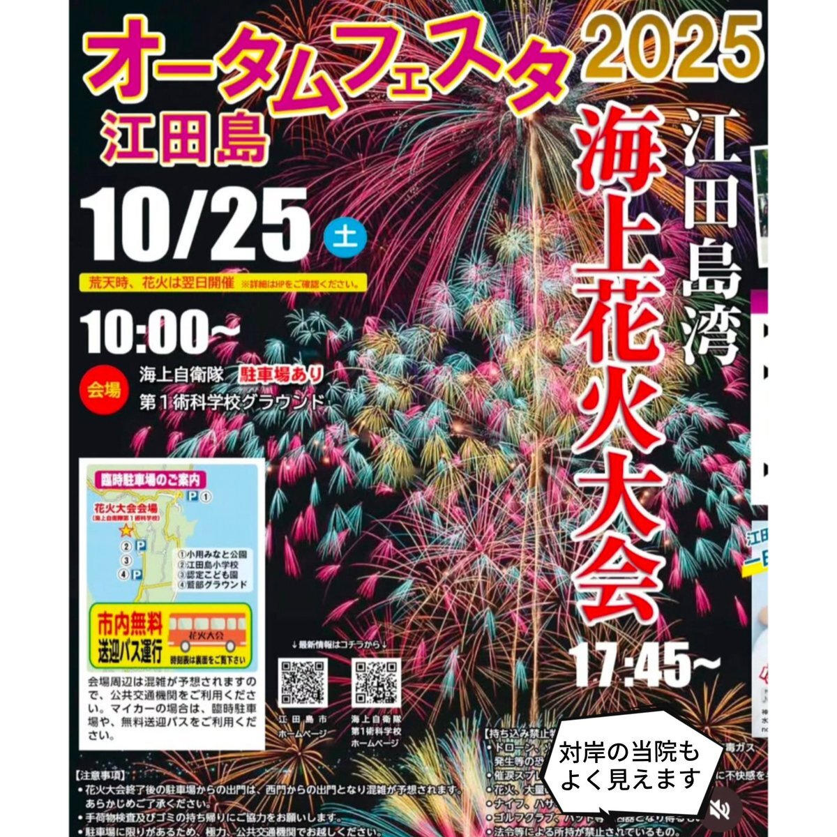 本日は『オータムフェスタ江田島 2025』!!午前からイベントあり、フィナーレは海上花火大会!! 対岸の当院や長瀬海岸からも観れます。 なんとか天気がもって欲しいですね。 #広島県 #江田島 #島の病院おおたに #オータムフェスタ2025 #オータムフェスタ江田島 #海上花火大会 pic.x.com/CDdsVGdorN