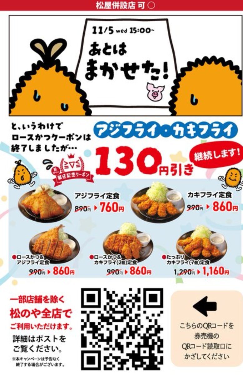 なんと⁉️130円引きがまだ継続 します❣️ ⭐️カキフライ定食990→860円 そして、たっぷりカキフライ(7個) 定食🦪1290→1160円 🔥ロースかつ&カキフライ(2個) 990→860円凄いーーー❗️ お腹空いた🤤 揚げたてのジューシーな豚かつと ミルキーなカキフライをサクじゅわと食べる😋🎶 #松のや #カキフライ x.com/matsu_noya/sta…
