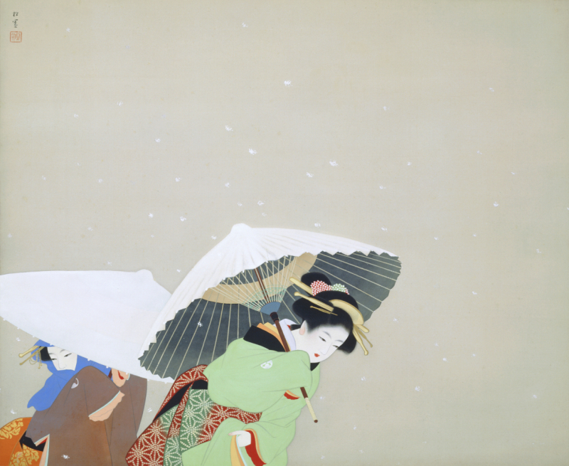 #上村松園展 オリジナル和菓子「雪の日」 上村松園《牡丹雪》(#山種美術館)の、降りしきる雪の中、女性がさす傘をかたどりました。 中は上質な素材にこだわった菊家特製のこしあん入りです。 #カフェのある美術館 pic.x.com/V7ntMoNM8p