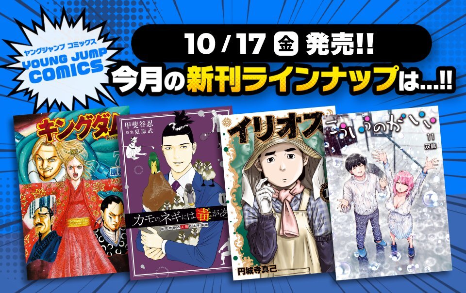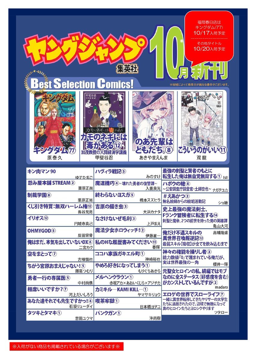 📕コミック新刊情報📕 10/17発売の #集英社 ヤングジャンプコミックの福岡入荷日のお知らせ ✅10/17入荷 #キングダム(77) ✅10/20入荷 #こういうのがいい(11) #カモのネギには毒がある(12) などその他タイトル #フタバ図書TSUTAYAGIGA福岡春日店 pic.x.com/scYrU5t9v3