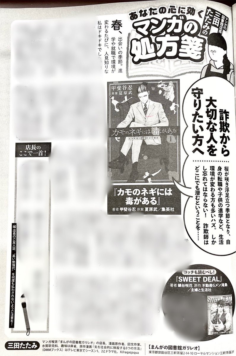 【店長の漫画コラム】 掲載されてます! 「実話ナックルズウルトラ」vol.31 マンガの図書館店長 三田たたみの 「あなたの心に効くマンガの処方箋」 ✨紹介作品はコチラ!✨ 📚『#カモのネギには毒がある』 📚『#SWEETDEAL』 💸詐欺から大切な人を守りたい人はぜひ見てね〜!💰 #三軒茶屋 #漫画喫茶