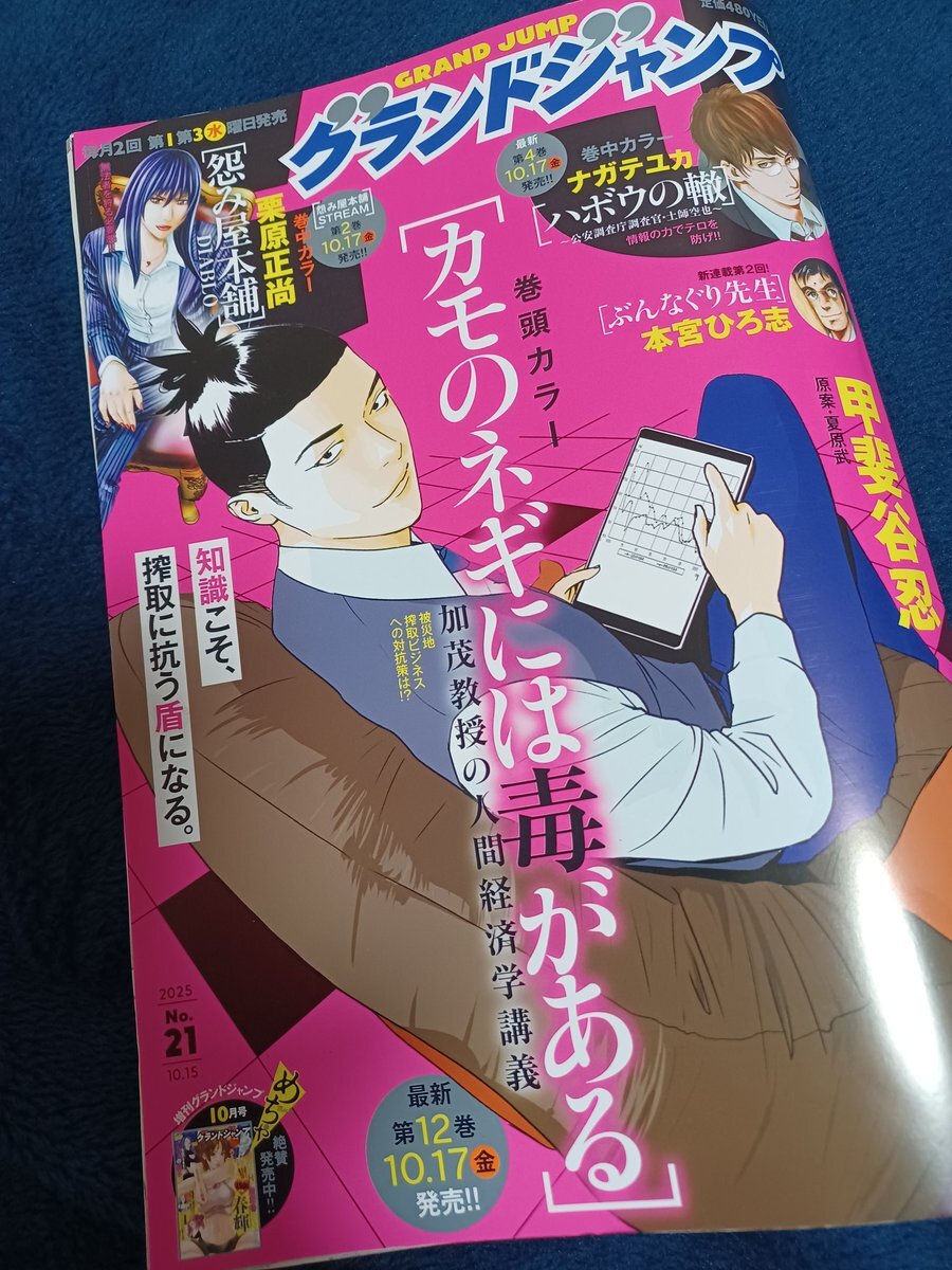 雑誌フェチ262 #グランドジャンプ2025年No21 表紙巻頭カラーは #カモのネギには毒がある これを一読するだけでも価値がある ドラマ化もしくは映画化を楽しみにしています ↓ #ハボウの轍 #ラジエーションハウス #空をまとって #DrEggs pic.x.com/17vnPiz5gl x.com/mogura_nin_nin…