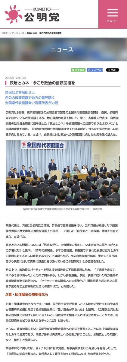 本日、公明党は自民党との連立を一旦白紙とし、関係に区切りをつける決断をしました。