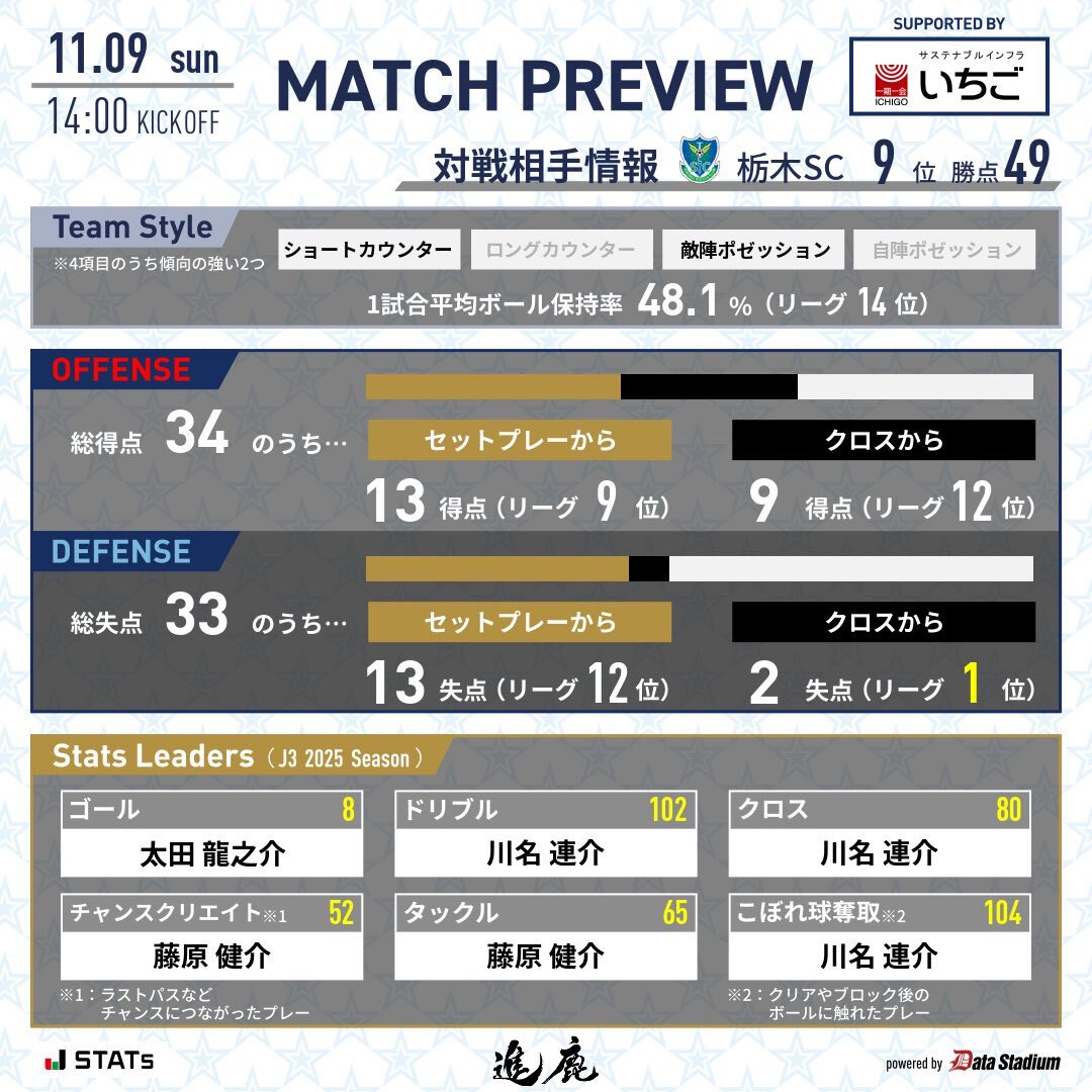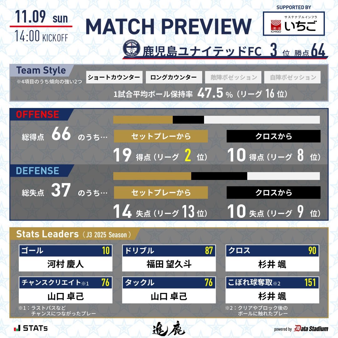 【11/9(日)アウェイ栃木SC戦】 明日はアウェイ栃木SC戦🔥 🏆明治安田J3リーグ 第35節 🆚#栃木SC 🗓️ 11/9 14:00キックオフ 🏟️#カンセキスタジアムとちぎ 試合情報等について 栃木SC HPをご確認下さい。 ⬇️ tochigisc.org/20251109game_i… #鹿児島ユナイテッドFC pic.x.com/JH71JMXocd