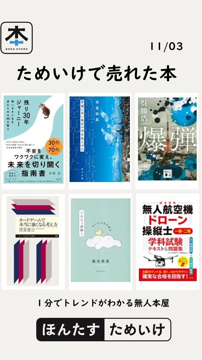 無人本屋 #ほんたす 11月3日 ✂「文具の日」📌 「文房に備える道具」意味で「文房具」 📖では昨日売れた本の紹介📖 #残り30年ジャーニー #普通に青い東京の空を見上げた #爆弾 #カードゲームで本当に強くなる考え方 #ミキティ語録 2 #無人航空機(ドローン)操縦士一等・二等学科試験テキスト&問題集 pic.x.com/IYedYkUL4I
