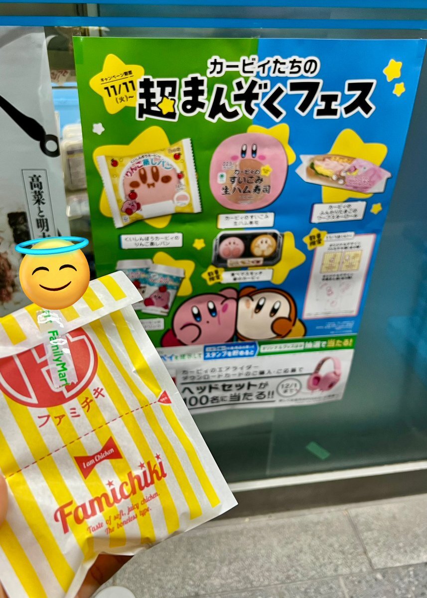 今ファミリーマートと星のカービィが コラボしてるみたいで、たまたま スパイシーチキンを買ったら 袋がカービィになってた。 @famima_now #星のカービィ #カービィたちの超まんぞくフェス #ファミリーマート #ファミマ #コラボ商品 #琉生_Louis👑 pic.x.com/SELqGlhZWt