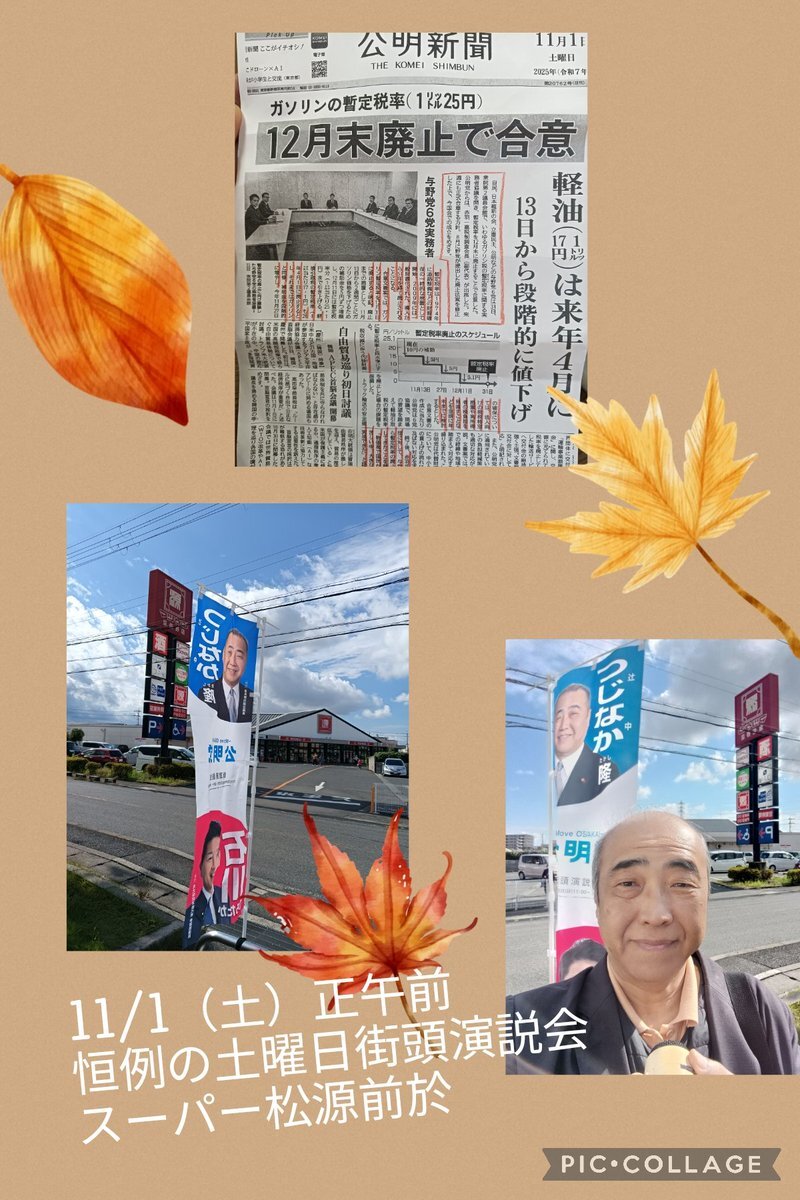 11/1(土)午前中、市役所会派室にて、打合せ。終了後、スーパー松源前へ移動。#恒例の土曜日街頭演説会 を実施しました。今日は、#公明新聞 1面の記事。#ガソリンの暫定税率 #12月末廃止で合意 の内容を説明させて頂きました。物価高に苦しむ国民のため、公明党の取り組みを今後も訴えて参ります pic.x.com/PQFhqOxPl8