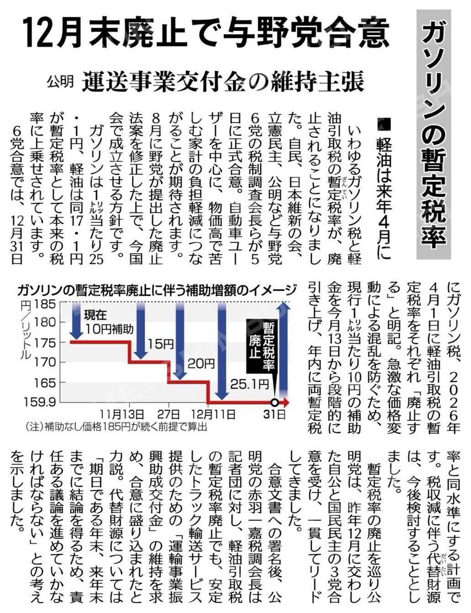 #ガソリンの暫定税率)12月末廃止で与野党合意/公明、運送事業交付金の維持主張/軽油は来年4月に #公明新聞電子版 2025年11月09日付 komei.or.jp/newspaper-app/ pic.x.com/CwdiAL41q1