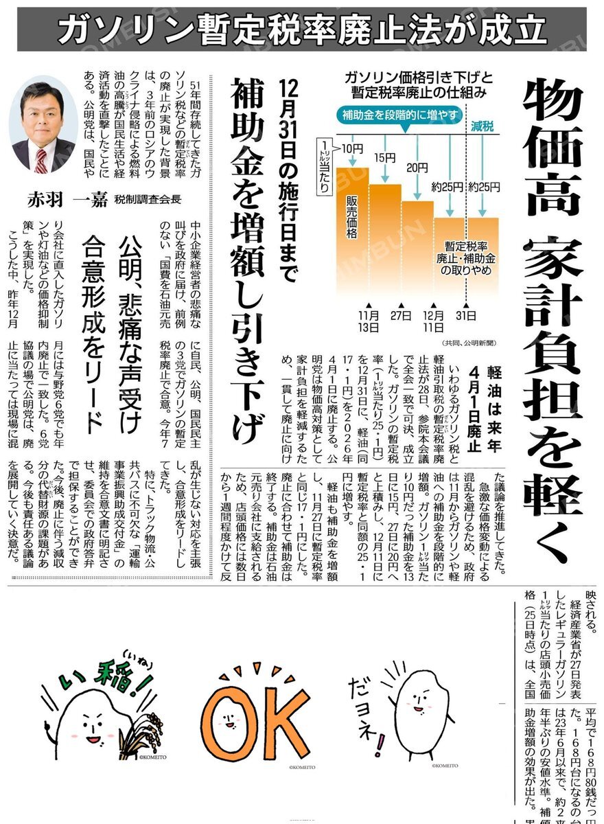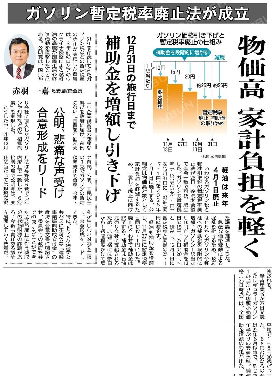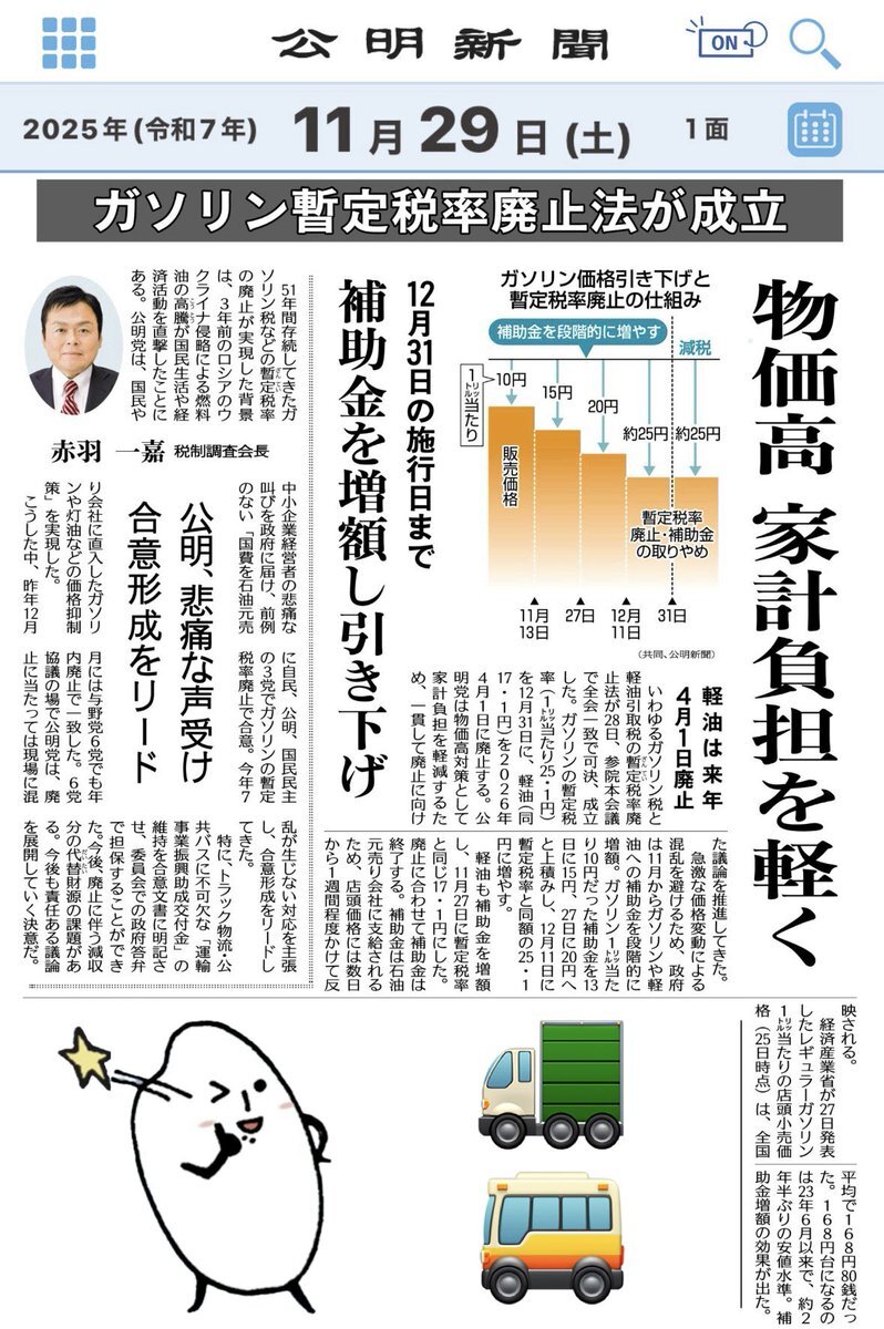 ◎本日付 #公明新聞 1面 #ガソリン暫定税率廃止法 が成立 ◆物価高、家計負担を軽く ◆12月31日の施行日まで補助金を増額し引き下げ ◆軽油は来年4月1日廃止 ◆公明、悲痛な声受け #合意形成リード /赤羽一嘉税制調査会長 pic.x.com/qpJ7hGIB0A