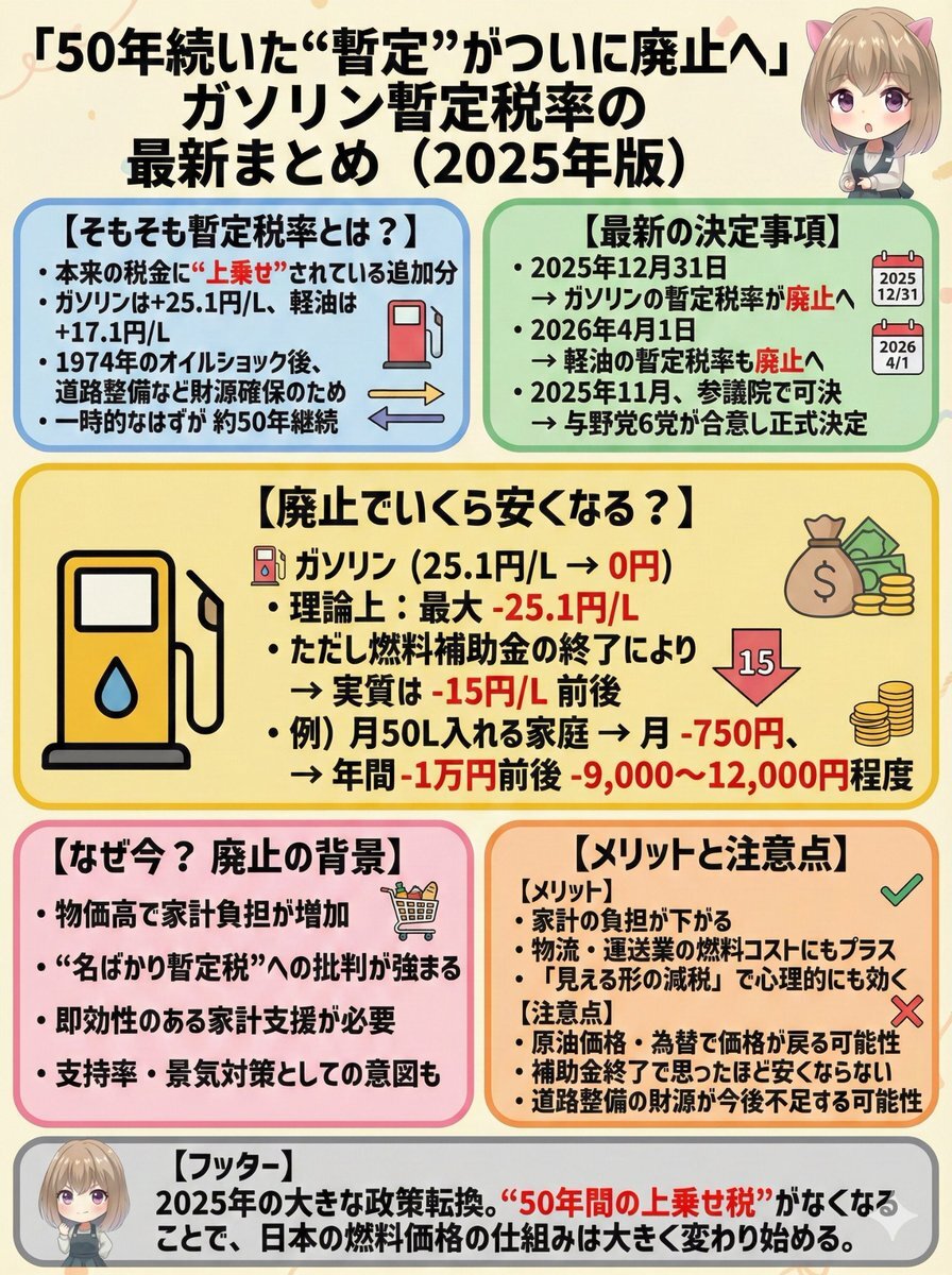 ガソリン暫定税率廃止法がついに成立し、12月31日から正式に廃止されます。これにより、ガソリン価格は理論的に1リットルあたり約15円安くなる見込みです。今後の動向に注目です! #ガソリン暫定税率廃止法