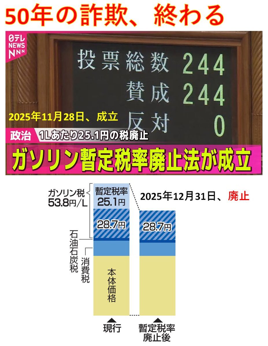 本日、#ガソリン暫定税率廃止法 が、満場一致で可決されました。 1リットルあたり25.1円上乗せされていたガソリン税の暫定税率は12月31日で廃止。 軽油引取税の暫定税率(1リットルあたり17.1円)も来年4月1日に廃止されます。 選挙を通じて皆さまとお約束した公約。 pic.x.com/4y2R4gUCbl