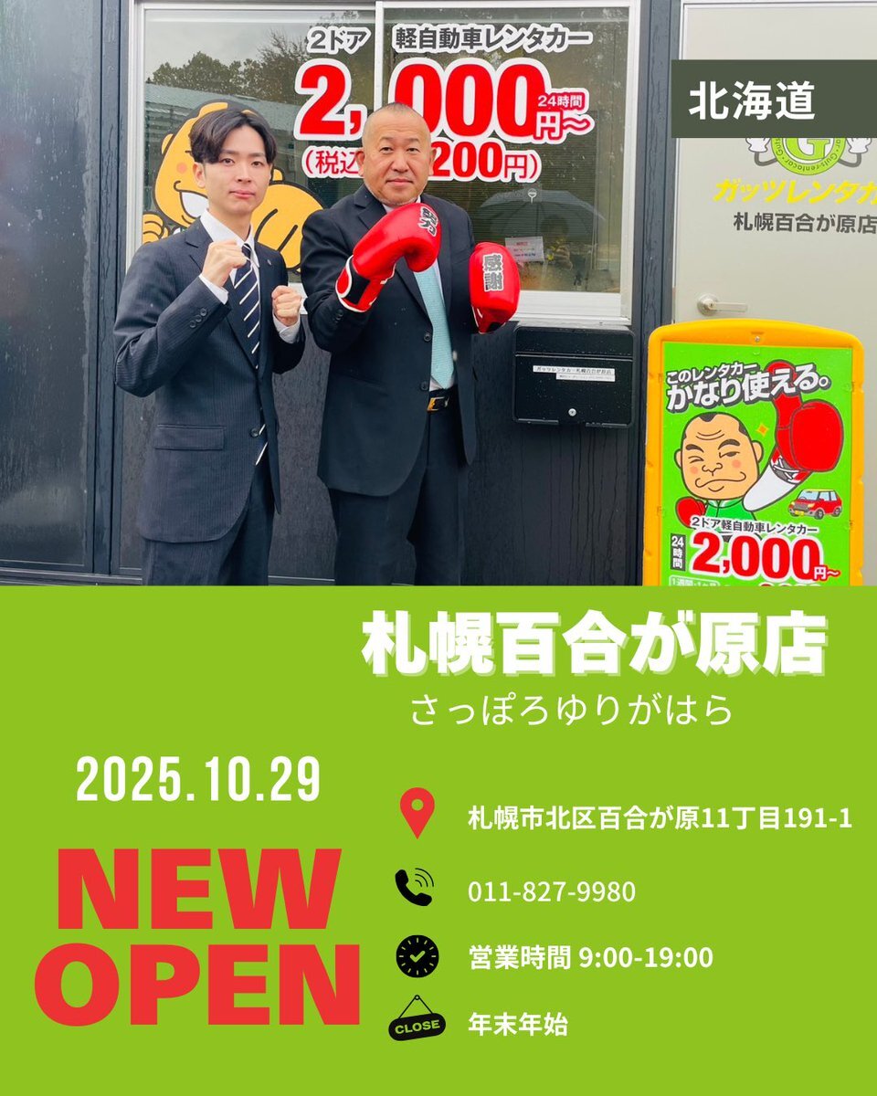 2025年10月29日(水)にガッツレンタカー札幌百合が原店がオープン致しました㊗️🎉 ガッツレンタカー札幌百合が原店 札幌市北区百合が原11丁目191-1 011-827-9980 guts-rentacar.com/shop/hokkaido/… #レンタカー #ガッツレンタカー #北海道 pic.x.com/d8farV71ce