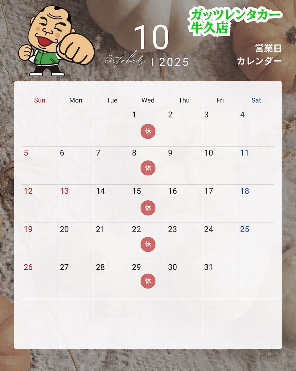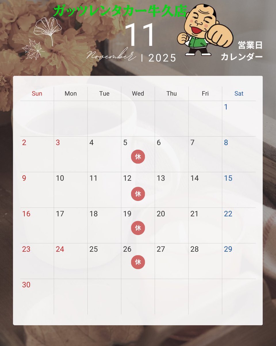 皆様こんにちは、ガッツレンタカー牛久店です🥊 11月定休日のお知らせです📢 毎週水曜日が定休日となっております! 定休日でのお貸出やご返却、お電話の対応はできませんのでご理解の程よろしくお願いいたします🙇♂️ #ガッツレンタカー牛久店 #ガッツレンタカー #格安レンタカー #牛久市レンタカー pic.x.com/Jhpb7VKwLc