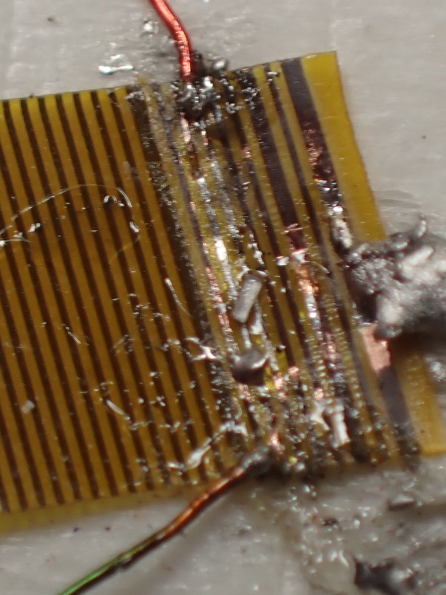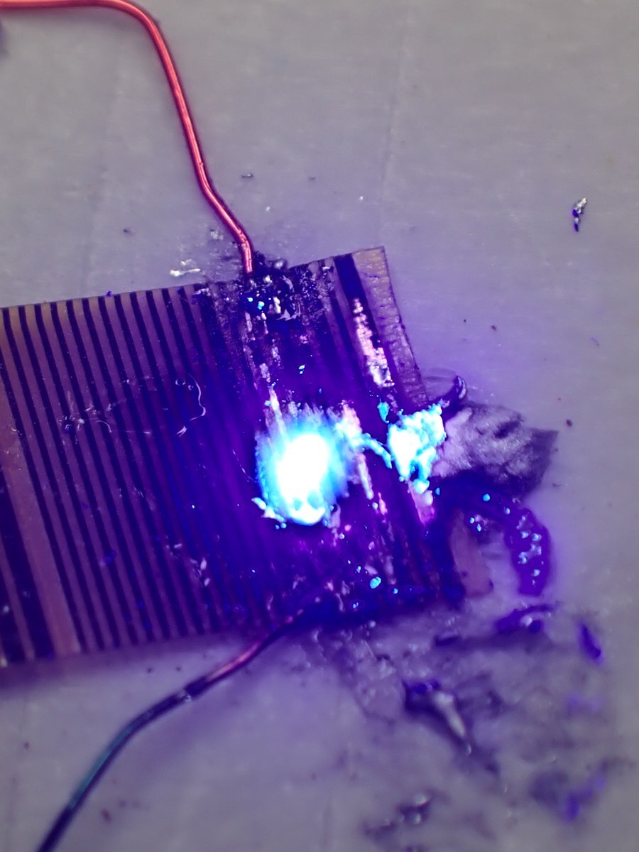 #ガンダムアーティファクト サイズのビームサーベルを作る 前回、0401を直列に0.08UEWで12個繋ぎましたが、動かすと切れまくる。その後も色々試行錯誤しましたが結局12個直列では短い。 ならばとピッチの細かいFPCを加工しLED並列に並べるテスト。会社のザコ道具で実証試験。 よしこれでいこう。 pic.x.com/t1ywyk3hyj