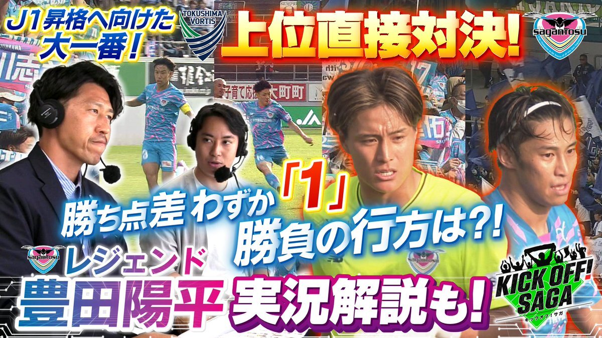 あす10時25分~ #キックオフサガ J1昇格へ向けた大一番! 徳島ヴォルティスとの上位直接対決😤 勝ち点差わずか「1」 J1昇格へ向けた重要な一戦となった徳島ヴォルティスとの大一番。 #サガン鳥栖 レジェンド豊田陽平さんの実況解説と併せて試合を振り返ります! pic.x.com/JoNK8OUd1j