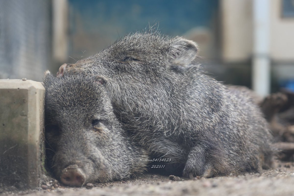 アイちゃん、マイちゃん仲良く昼寝です。     2025.10.23 #上野動物園 #クビワペッカリー pic.x.com/j2vTchAFhC