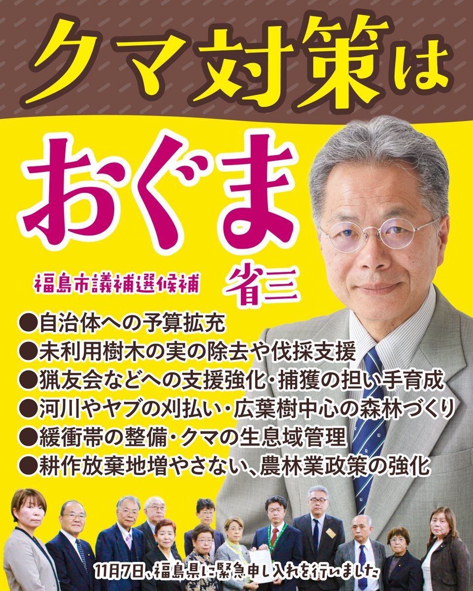 #クマ対策はおぐま #福島市議補選 #福島市長選挙 \ 福島市内でもクマの出没が 深刻な問題となっています 人的被害を防ぐ 緊急対策とともに 緩衝帯づくりや 森林環境整備、 耕作放棄地を増やさない 農林業政策が必要です #おぐま省三 は 県内の議員と力あわせ 福島県に対策を提案しました pic.x.com/C1HG2lFNKN