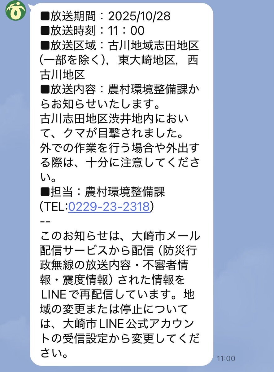 【⚠️クマ目撃 相次ぐ】 11/1〜11/2の夕方から朝に県内で27件。仙台市は15件(泉区6・太白区5・青葉区4)で、夕方〜夜に集中。そのほか大和町4/大崎市4/栗原市1/富谷市1/大衡村1/登米市1。見かけても近づかず通報を!暗い時間帯の外出は特に注意です。 #宮城 #クマ注意 news.yahoo.co.jp/articles/0cf96…