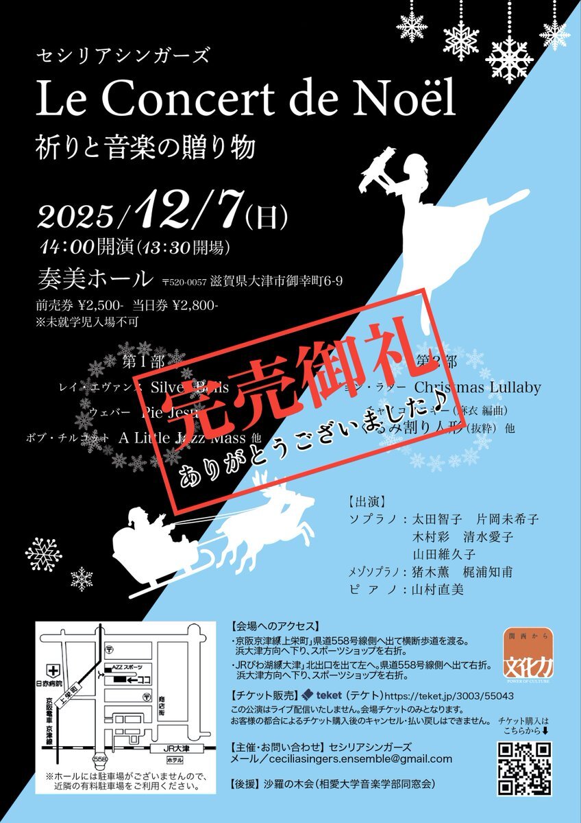 🎉完売のお知らせ🎉 秋も深まり夜はすっかり肌寒くなりましたね🍁🍂 12月7日に奏美ホールにて開催の「Le Concert de Noël - 祈りと音楽の贈り物 -」おかげさまで完売いたしました!ありがとうございます🎶 本番まであと1ヶ月、さらに音楽作りに励んでまいります💪 #クリスマスコンサート #完売御礼 pic.x.com/2VS6PI0eIV